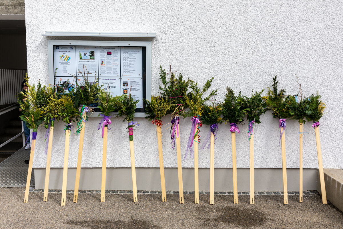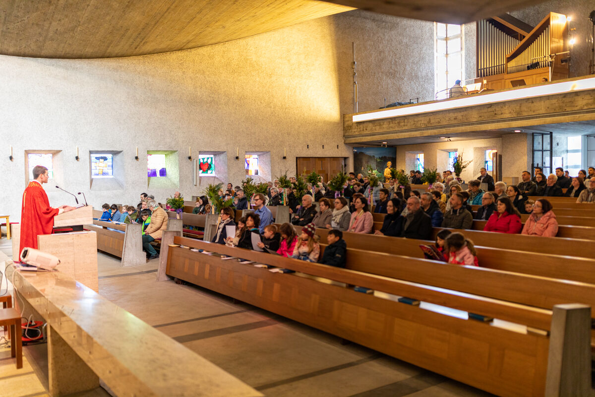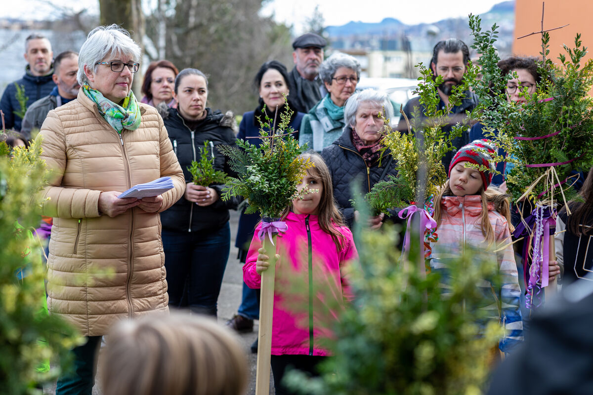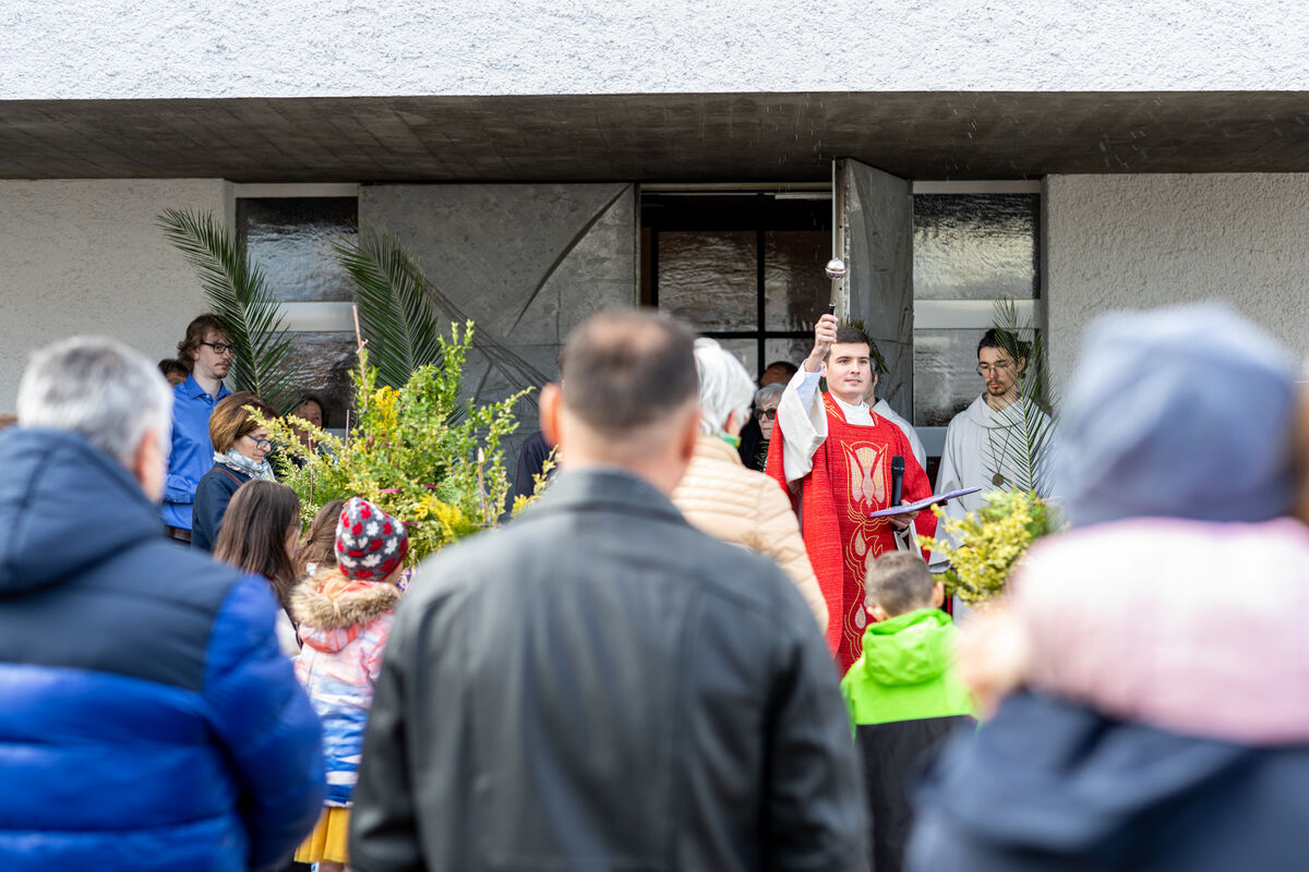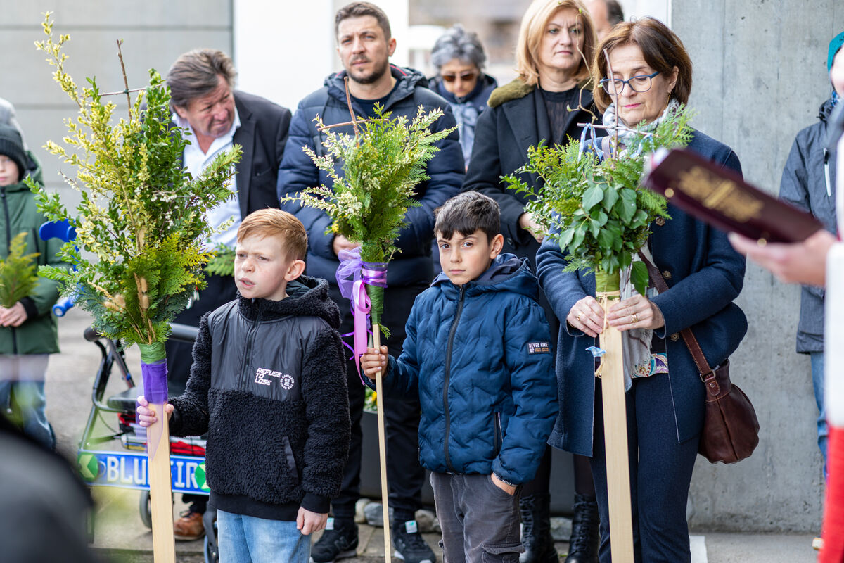 An einem frühlingshaften Sonntagmorgen feierten wir Jesu Einzug in Jerusalem und eröffneten somit die Heilige Woche. Am Tag zuvor haben sich Interessierte versammelt, um gemeinsam wunderschöne Palmkreuze zu binden, die für den Gottesdienst verwendet wurden. Draussen auf dem Kirchplatz wurden die Palmzweige gesegnet, bevor dann die Palmsonntagsmesse in der Kirche gefeiert wurde, die musikalisch von Lukas Haltmeier an der Orgel und Corinne Sonderegger an der Oboe umrahmt wurde. Zugleich gab es Grund zum Feiern: Ansprechperson Kaplan Ivan Šarić feierte zum ersten Mal als Neupriester die Hl. Messe in Winkeln. Darauf wurde anschliessend im Pfarreiheim bei einem Apéro angestossen.