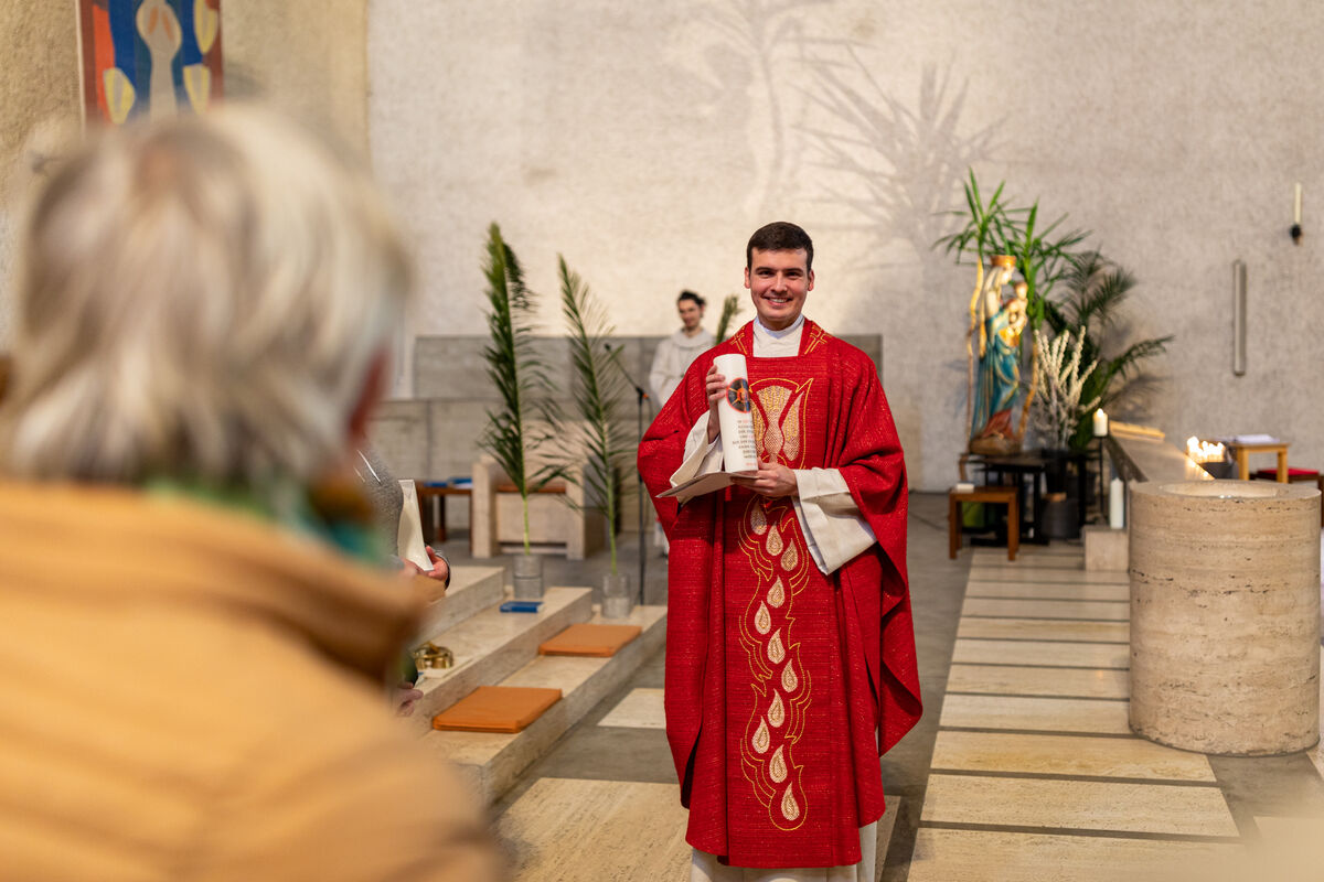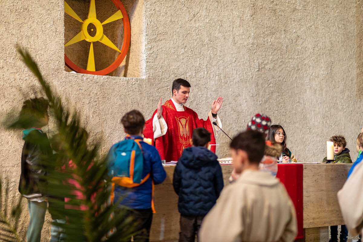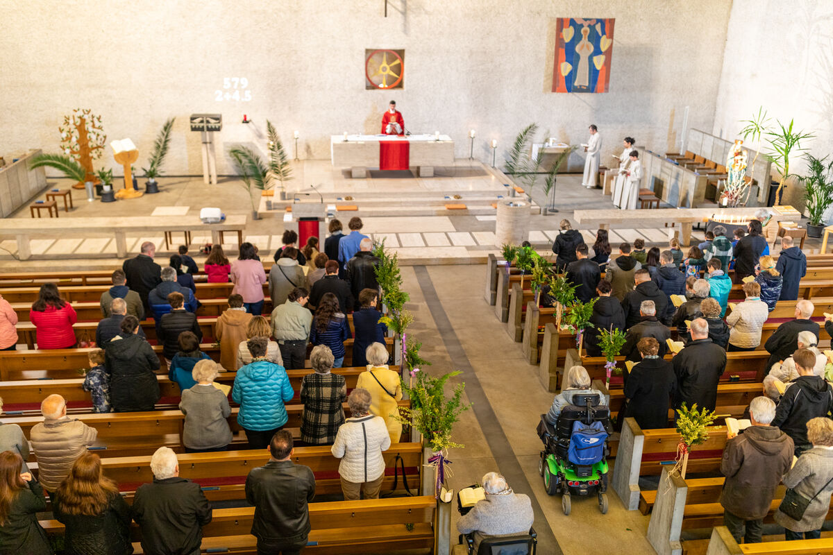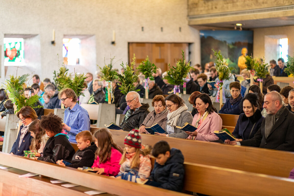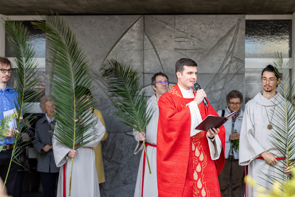 An einem frühlingshaften Sonntagmorgen feierten wir Jesu Einzug in Jerusalem und eröffneten somit die Heilige Woche. Am Tag zuvor haben sich Interessierte versammelt, um gemeinsam wunderschöne Palmkreuze zu binden, die für den Gottesdienst verwendet wurden. Draussen auf dem Kirchplatz wurden die Palmzweige gesegnet, bevor dann die Palmsonntagsmesse in der Kirche gefeiert wurde, die musikalisch von Lukas Haltmeier an der Orgel und Corinne Sonderegger an der Oboe umrahmt wurde. Zugleich gab es Grund zum Feiern: Ansprechperson Kaplan Ivan Šarić feierte zum ersten Mal als Neupriester die Hl. Messe in Winkeln. Darauf wurde anschliessend im Pfarreiheim bei einem Apéro angestossen.