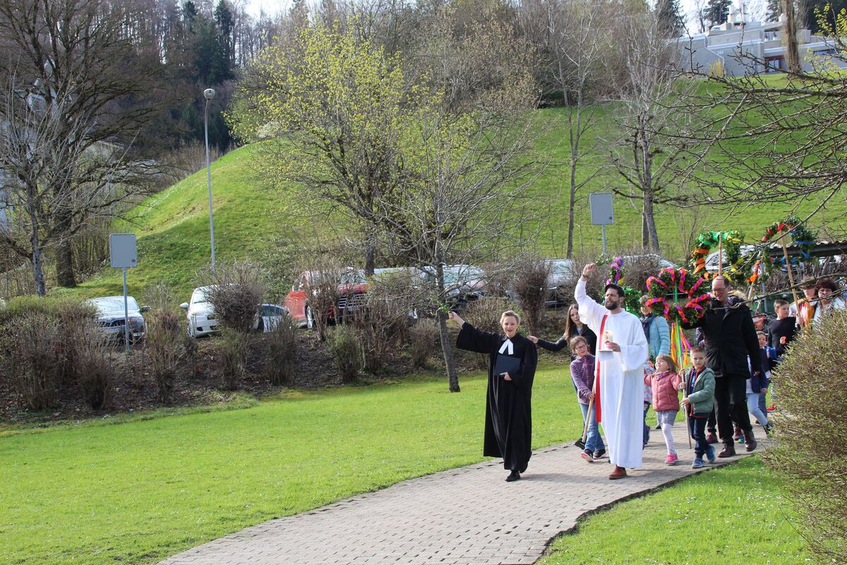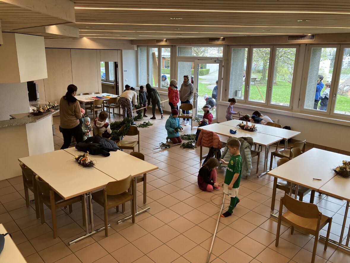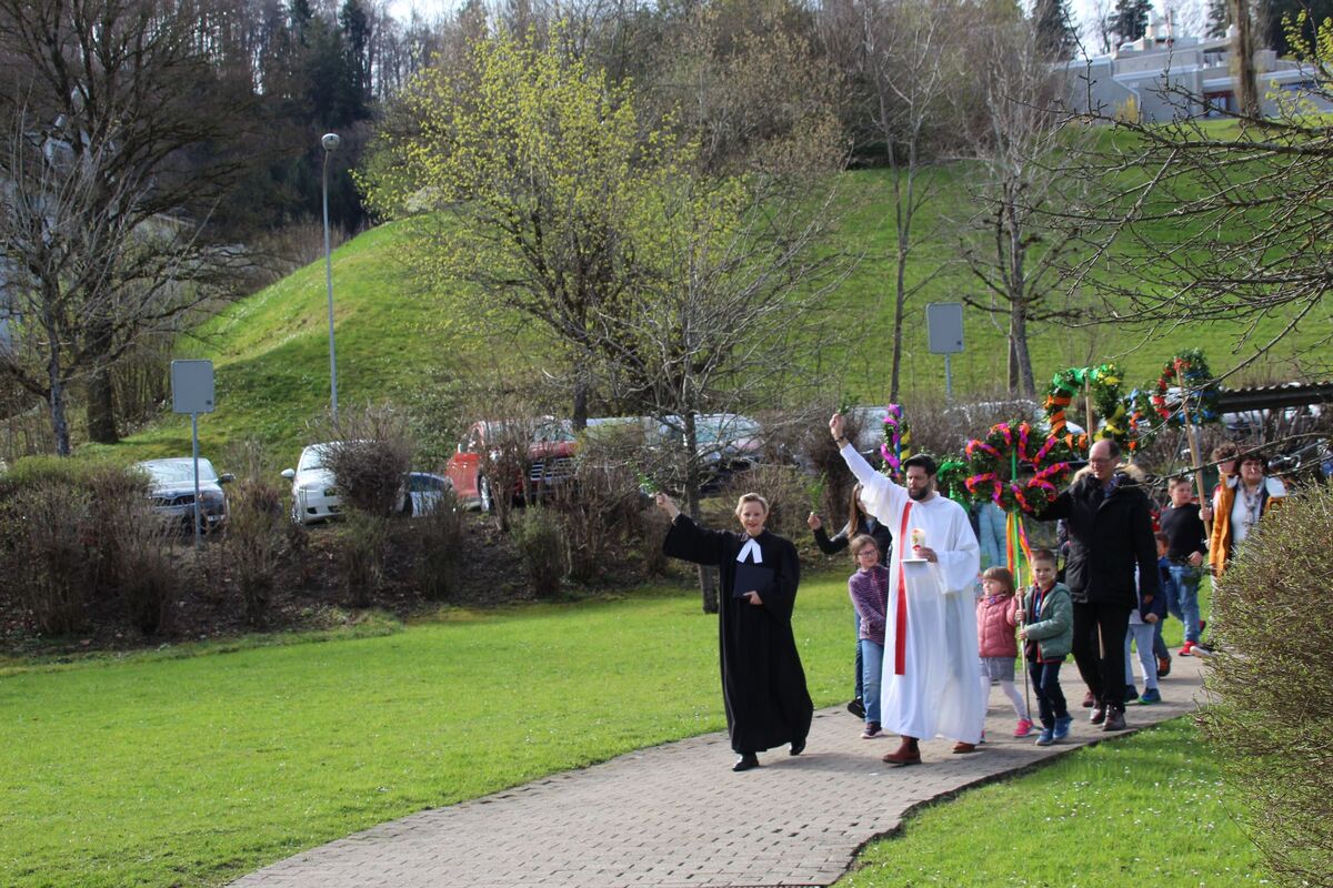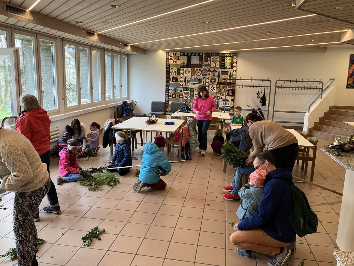 Auch dieses Jahr haben wir mit einer bunten Schar von Kindern in der Ökumenischen Gemeinde Halden Palmstecken gebunden. Kinder und Erwachsene waren fleissig und kreativ mit dabei. So entstanden fröhliche Palmstecken, die die Kindern dann am Palmsonntag stolz bei der kleinen Prozession rund um die Haldenkirche mitgetragen haben.