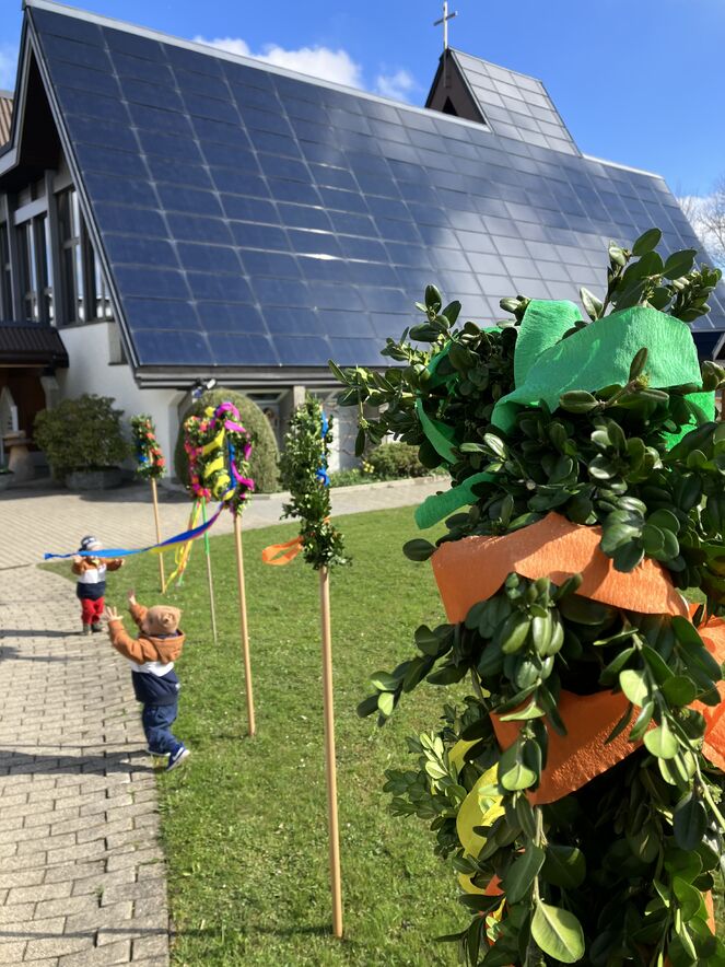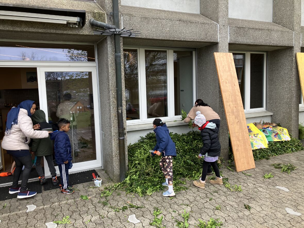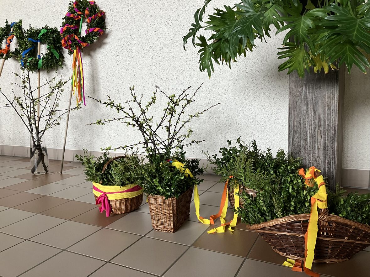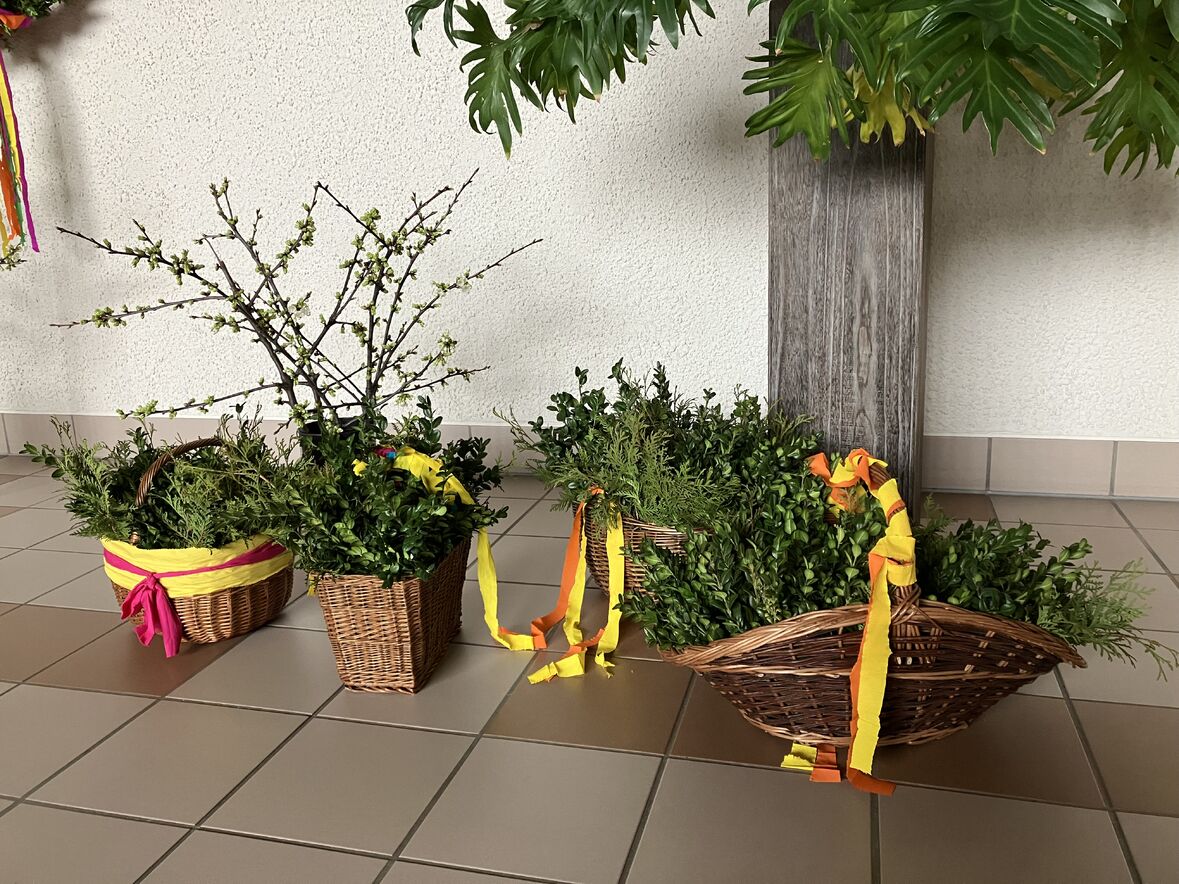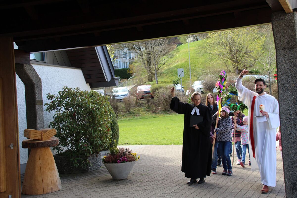 Auch dieses Jahr haben wir mit einer bunten Schar von Kindern in der Ökumenischen Gemeinde Halden Palmstecken gebunden. Kinder und Erwachsene waren fleissig und kreativ mit dabei. So entstanden fröhliche Palmstecken, die die Kindern dann am Palmsonntag stolz bei der kleinen Prozession rund um die Haldenkirche mitgetragen haben.