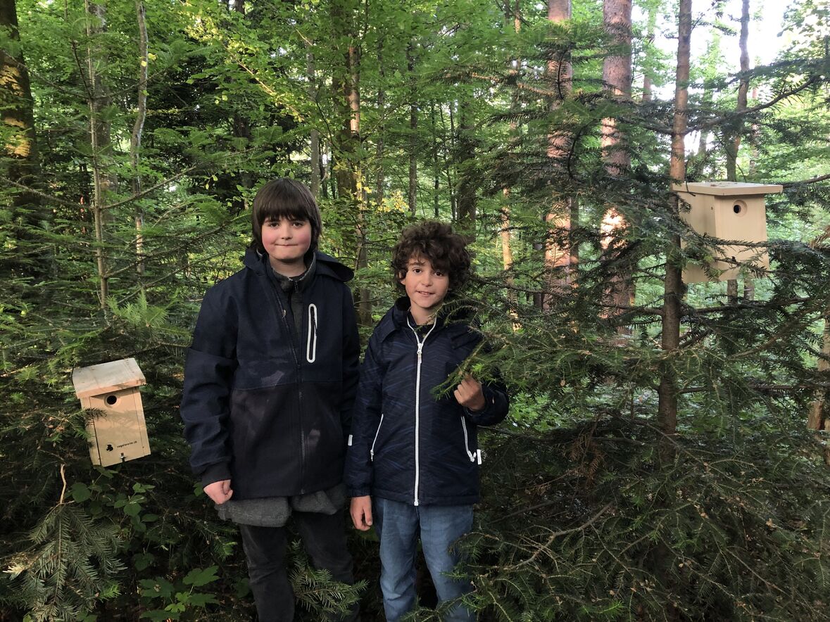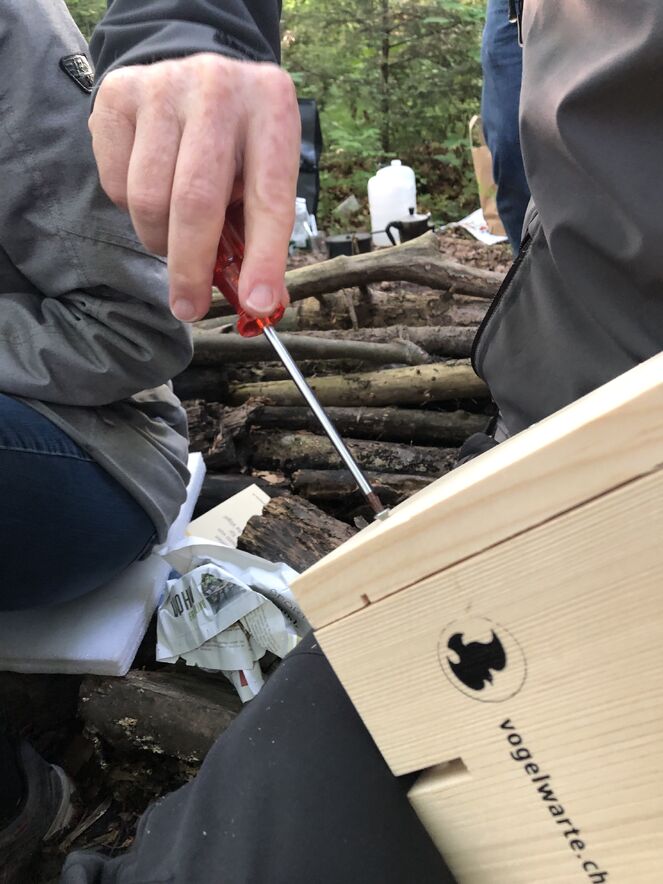 Als es dann hell wurde und das Vogelkonzert in vollem Gang war, gab es ein feines Zmorge-Buffett mit Kaffee, Tee und heisser Schoki vom Feuer - und natürlich konnte man auch Schlangenbrot über dem Feuer backen. Ausserdem wurden auch noch Vogelhäuschen der Vogelwarte Sempach gebaut, um auch daheim im eigenen Garten einen guten Wohnraum für unsere geflügelten Mitgeschöpfe zu schaffen. Gesponsert wurden die Vogelhäuschen von unserer Arbeitsgruppe "Grüner Güggel".