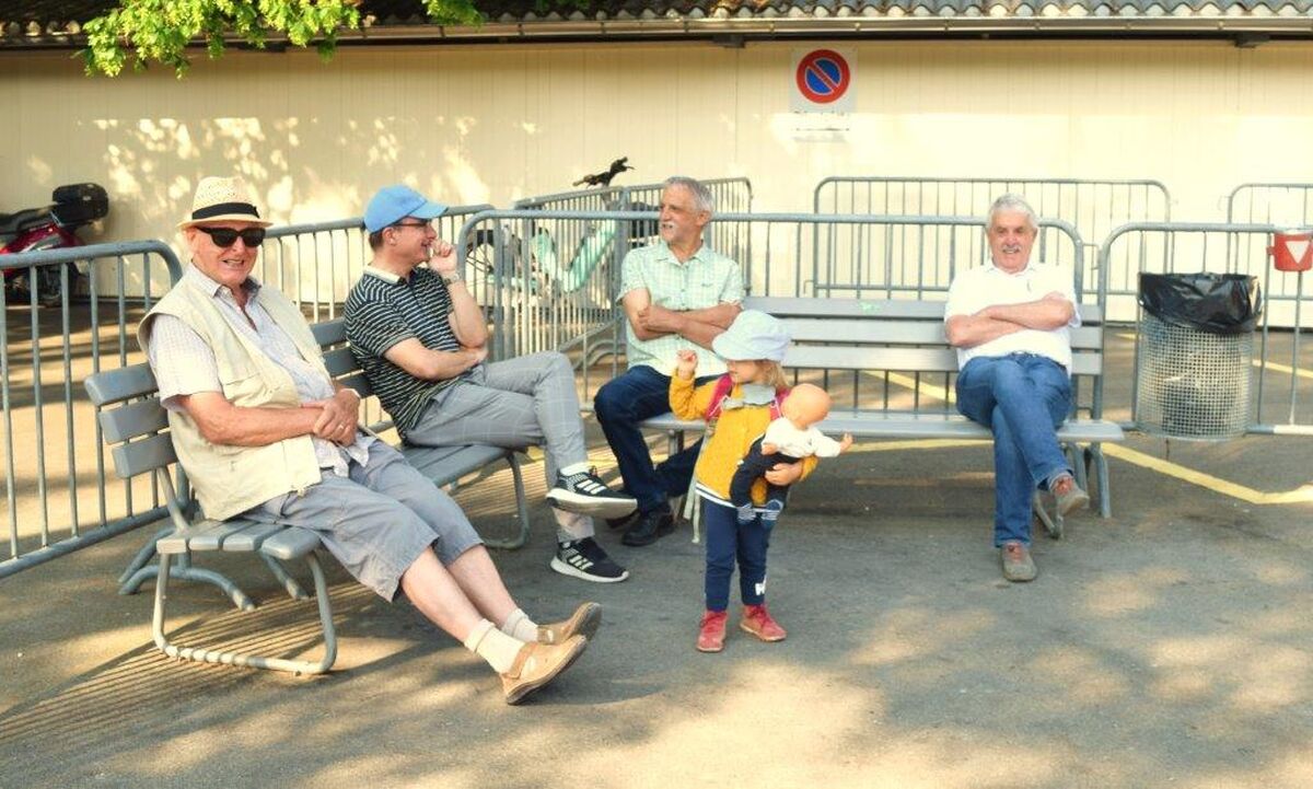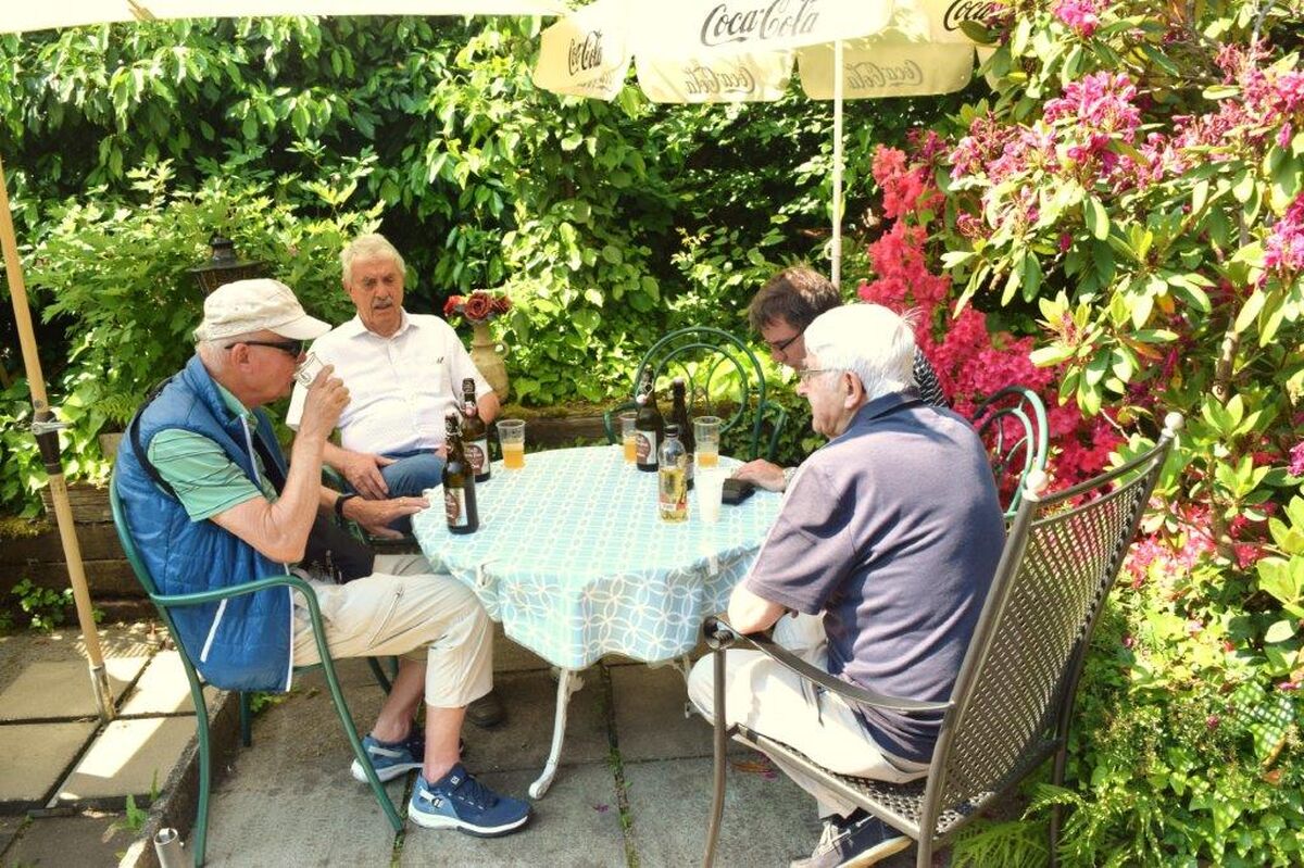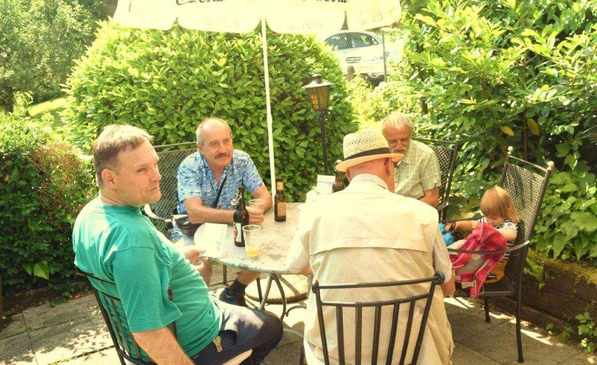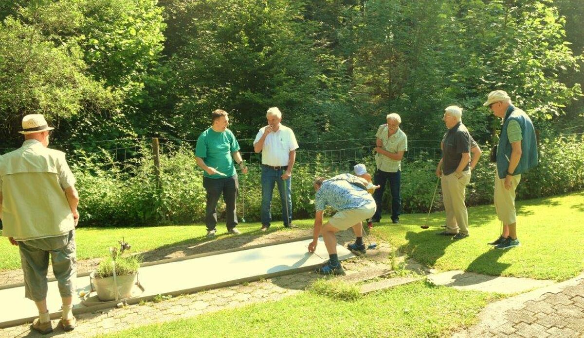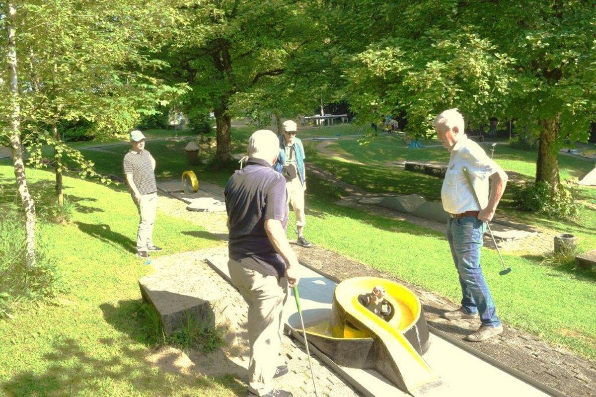 Eine Gruppe Männer versammelt sich auf Dreilinden zum gemeinsamen Minigolf-Spiel.