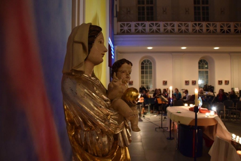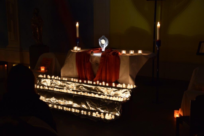 "Grüezi, möchten Sie hier in der Kapelle eine Kerze anzünden?" so werden Passantinnen und Passanten eingeladen einen Moment der Stille und Besinnung in der Schutzengelkapelle zu erleben. Wer möchte bekommt direkt eine kleine Kerze in die Hand und kann damit in die Kapelle. Diese ist schön gestaltet und stimmungsvolle Livemusik lädt zum mitsingen ein. Das Allerheiligste ist ausgesetzt.