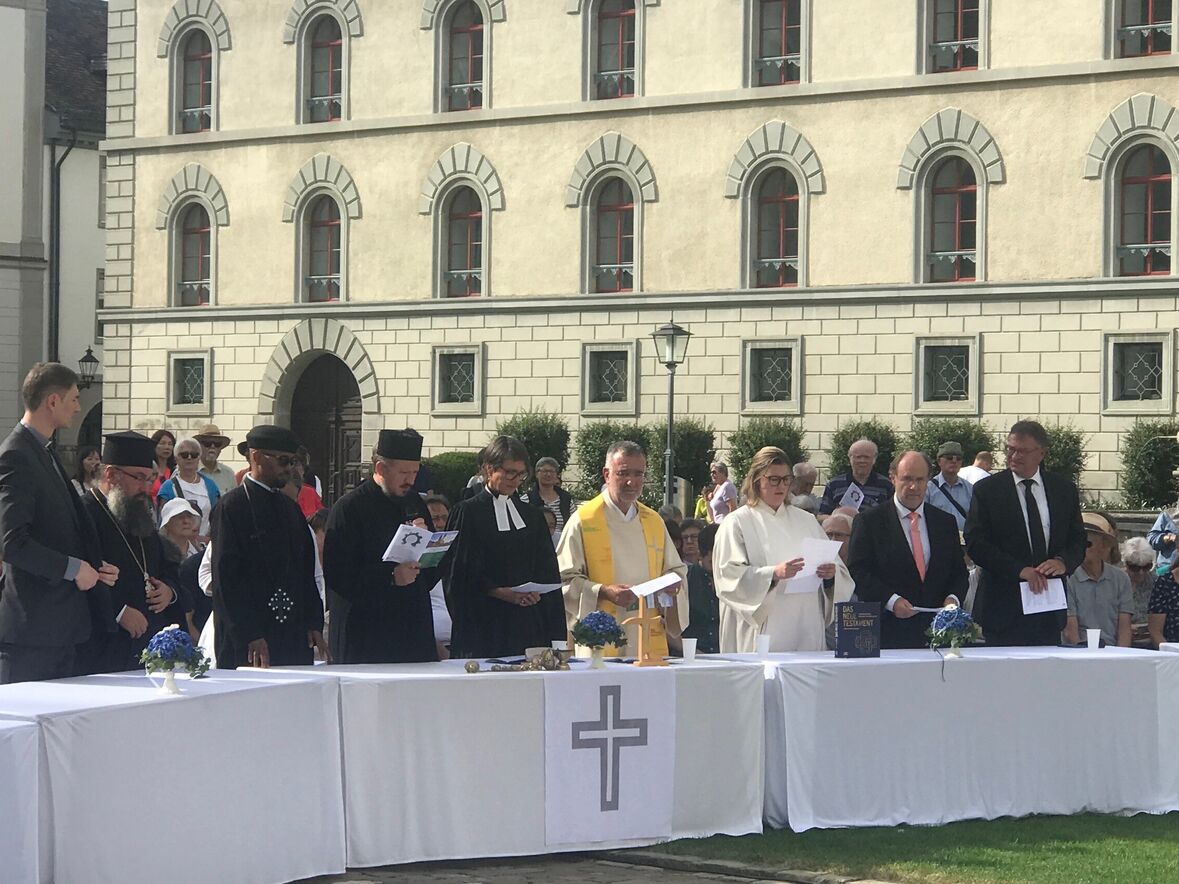 St. Gallens Stadträtin Sonja Lüthi begrüsste die Anwesenden und erinnerte daran, dass St. Gallen durch Vielfalt gekennzeichnet ist: Menschen aus 120 verschiedenen Ländern leben hier; über 60 Religionsgemeinschaften sind in St. Gallen ansässig. Der Bettag sei immer ein Moment gewesen, inne zu halten und sich auf das gemeinsame Wohl auszurichten. Regierungsrätin Laura Bucher hiess P. Michail Adam, den Priester der rumänisch-orthodoxen Gemeinde St. Antonius in St. Gallen willkommen. Im Auftrag seiner Gemeinde unterzeichnete er die «St. Galler Erklärung für das Zusammenleben der Religionen und den interreligiösen Dialog». Dieses Dokument wurde bereits im Jahr 2005 von Vertretern von Staat, Kirchen und Religionsgemeinschaften gemeinsam entwickelt. Die «St. Galler Erklärung» betont das Verbindende unter den verschiedenen Religionen und verpflichtet alle Unterzeichnenden auf einen respektvollen und wertschätzenden Umgang.