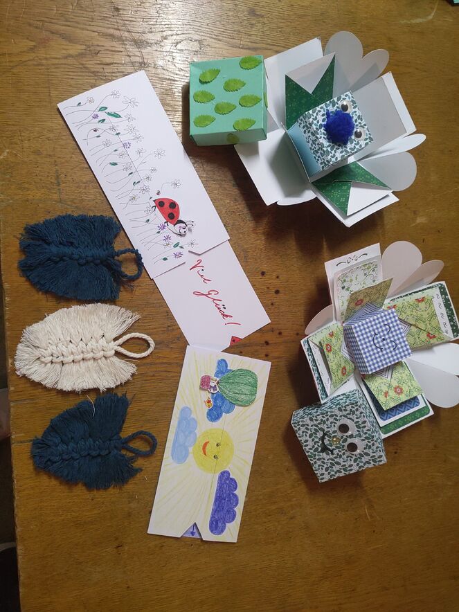 Schneiden, kleben, verzieren und knüpfen ergaben kreative Karten, Überraschungsboxen und Makramee-Federn.