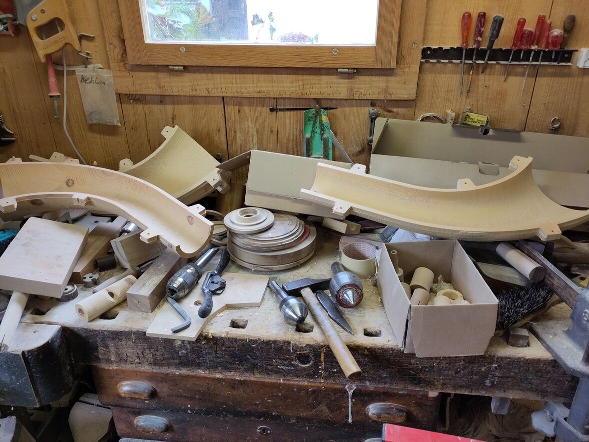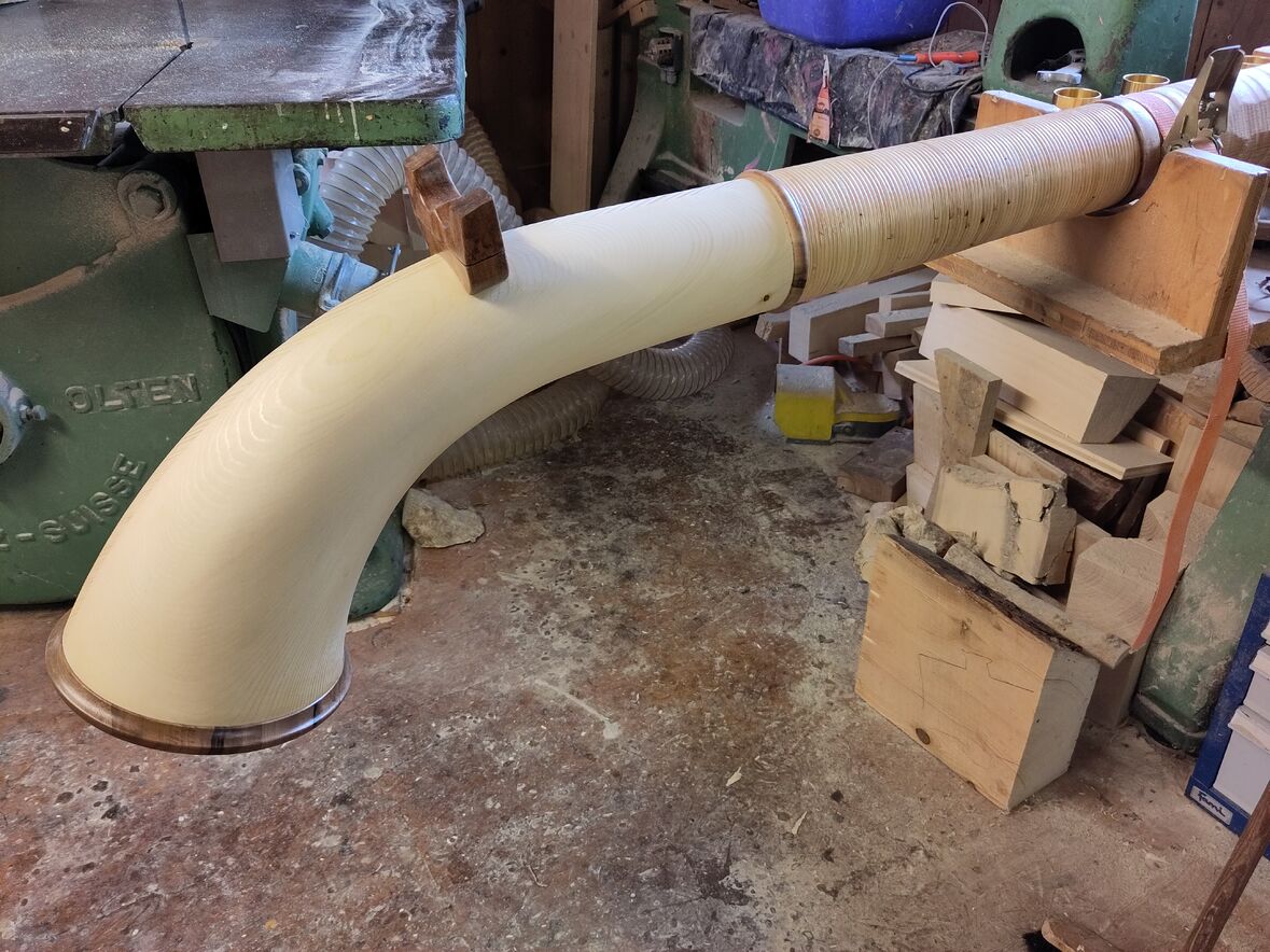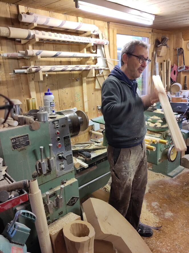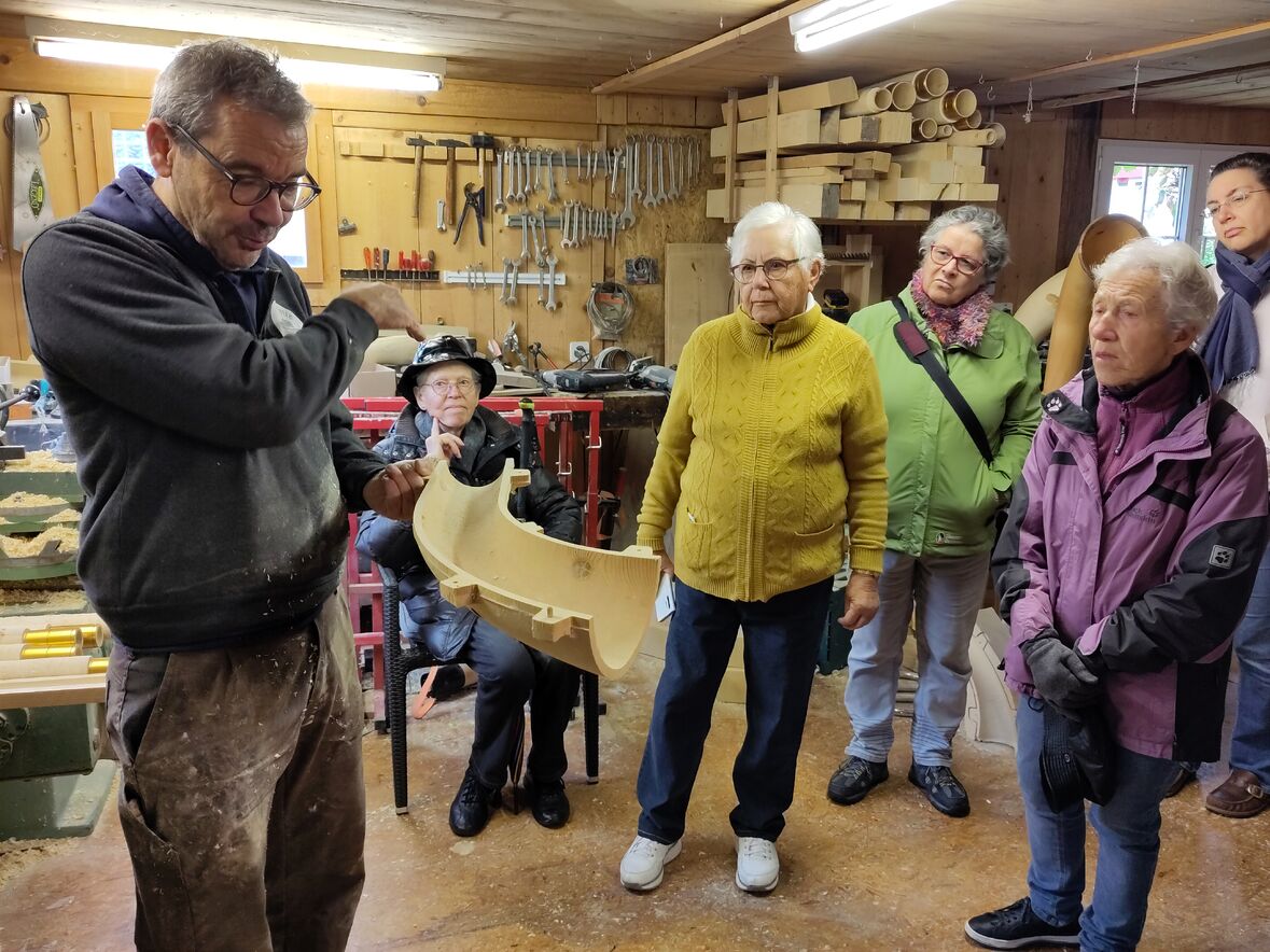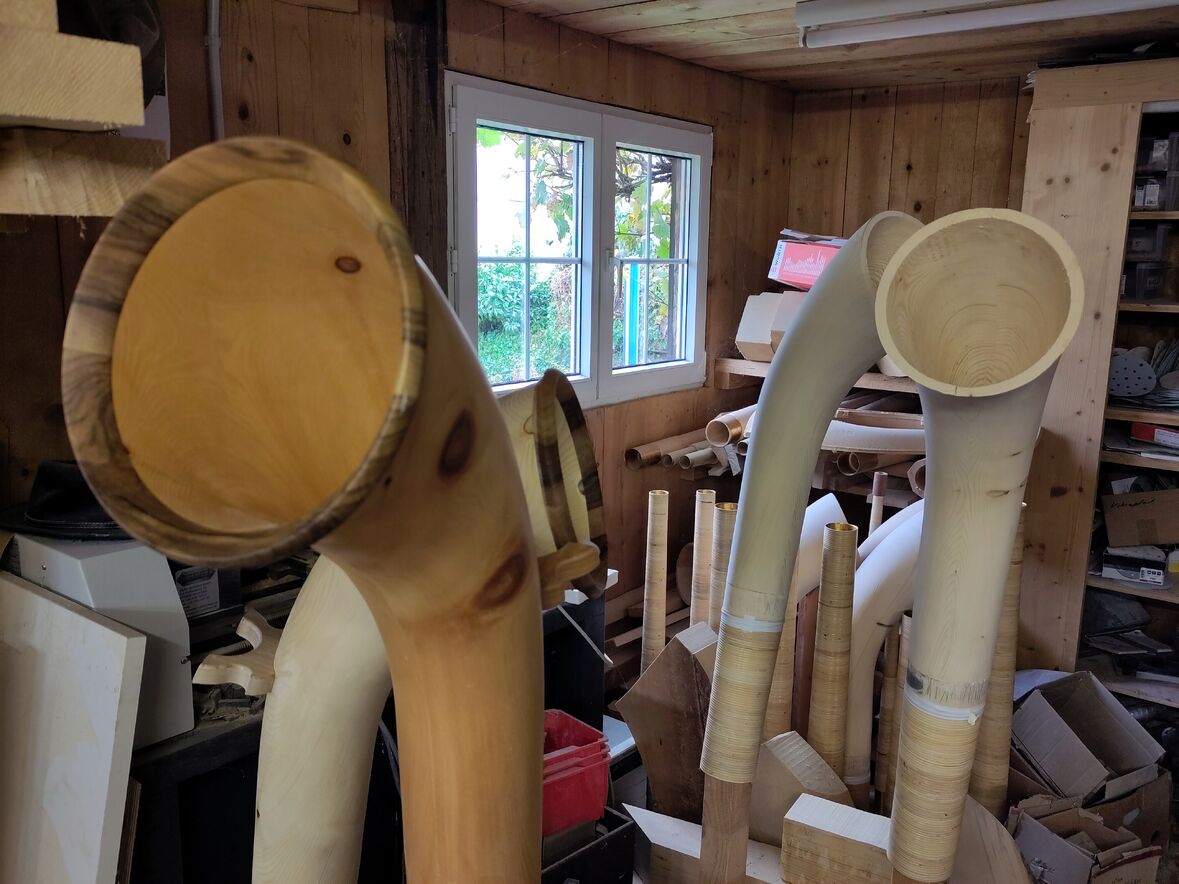 Roland Zahner, Alphornbauer aus Leidenschaft, führte uns am 21. Oktober durch seine Werkstatt in Niederuzwil. Wir lauschten seinen Ausführungen rund um die Geschichte des Alphorns (die nicht so schweizerisch ist, wie man oft glaubt) und staunten über die unterschiedlichen Klangkörper, die aus verschiedenen Alphörnern entstehen. Roland Zahner ist einer, der gerne tüftelt und Ideen umsetzt. Entsprechend spannend war es, einen Einblick in den Entstehungsprozess seiner Instrumente zu bekommen, die er bis nach Nordamerika exportiert. Wer wollte, durfte sich zum Schluss als Alphornbläserin oder -bläser versuchen und/oder sich bei einem feinen Znüni stärken.