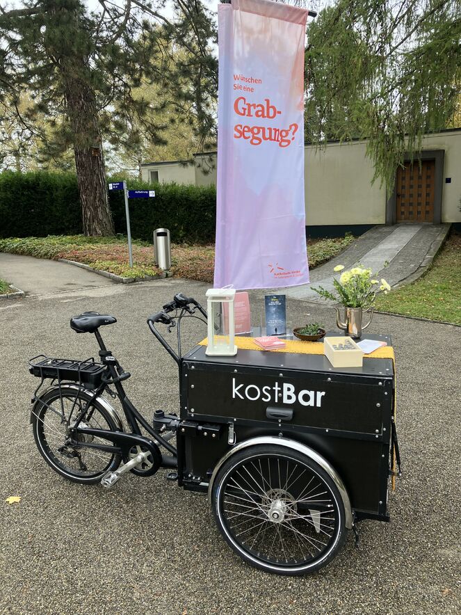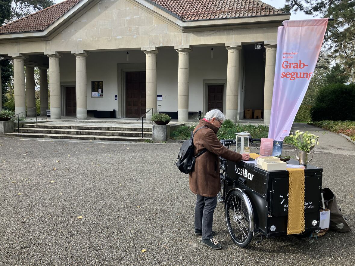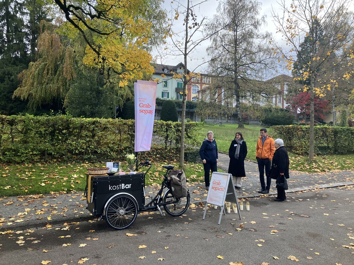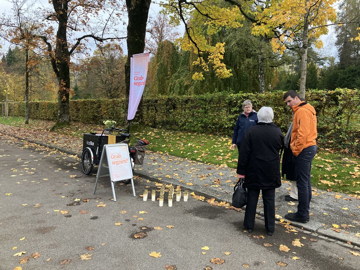 Dieses Jahr waren wir zum ersten Mal an Allerheiligen auf dem Ostfriedhof sowie auf dem Friedhof Feldli präsent, um Segenskits abzugeben. Die Idee der Cityseelsorge war, Menschen dabei anzuleiten, selbst das Grab ihrer Verstorbenen zu segnen. Dazu wurde eine Anleitung mit Gebeten und Texten zur Verfügung gestellt sowie ein Fläschchen mit Weihwasser und eine Grabkerze.