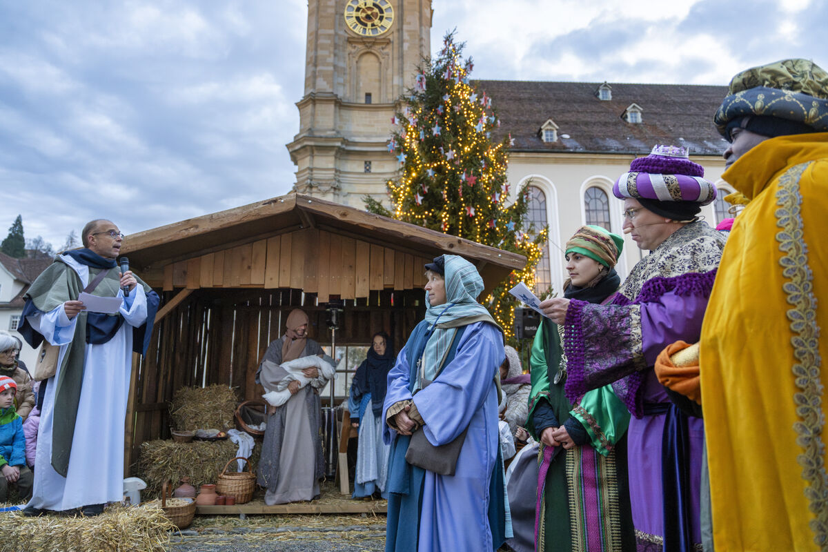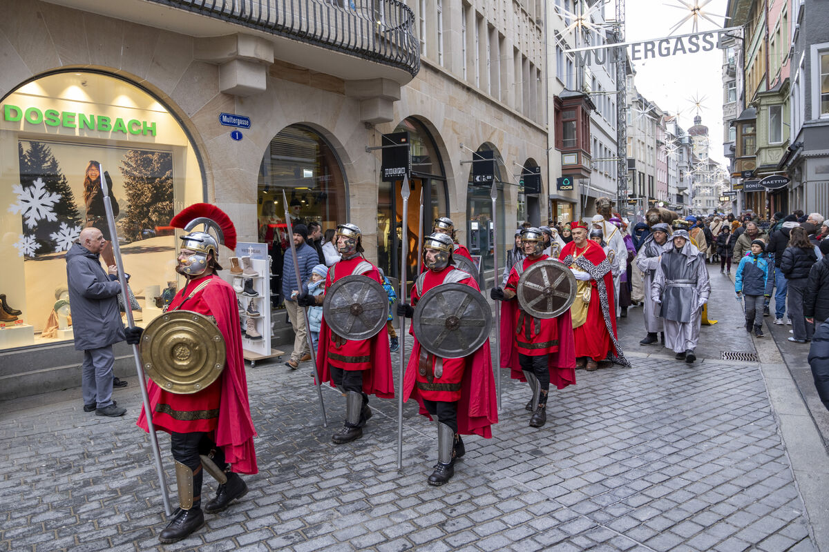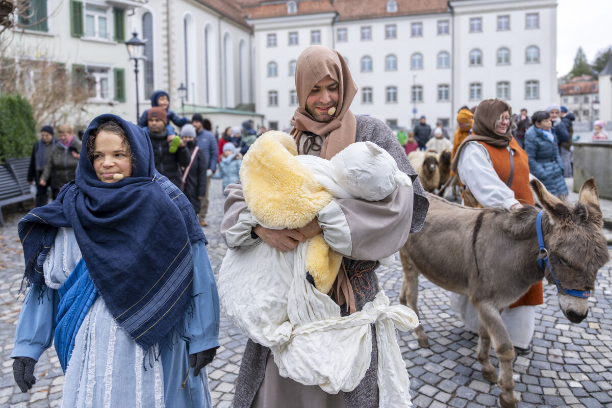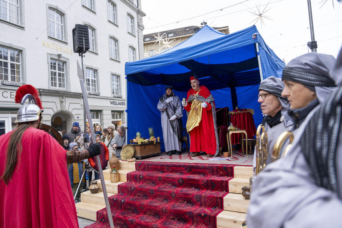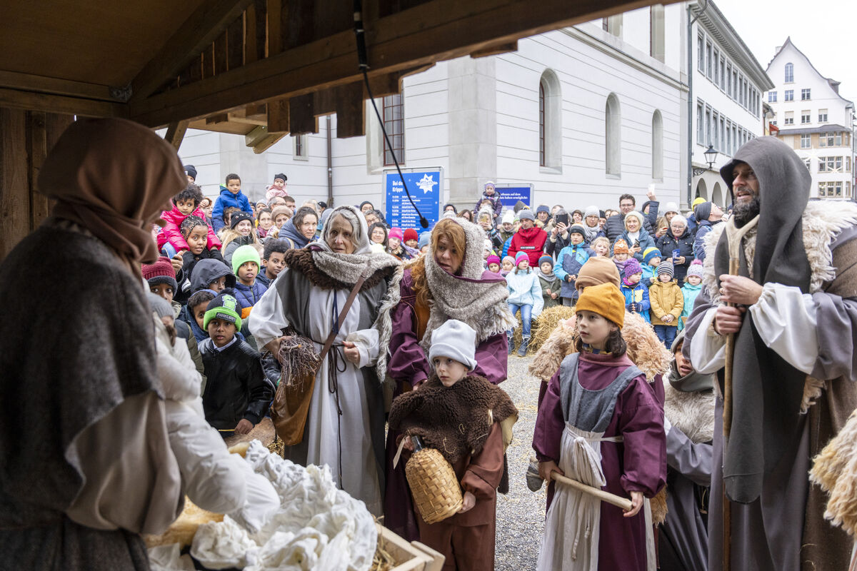 Bei gutem Wetter und vor grossem Publikum ist an drei Standorten in der St. Galler Innenstadt die Weihnachtsgeschichte aufgeführt werden.