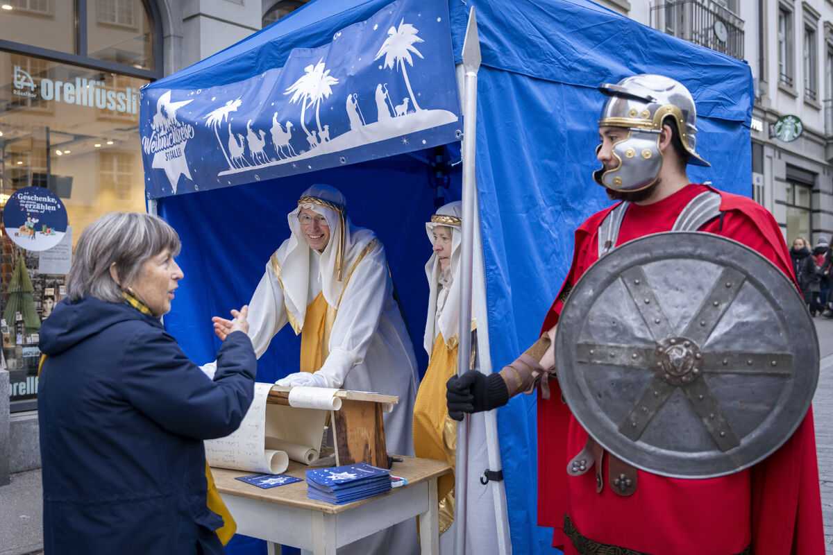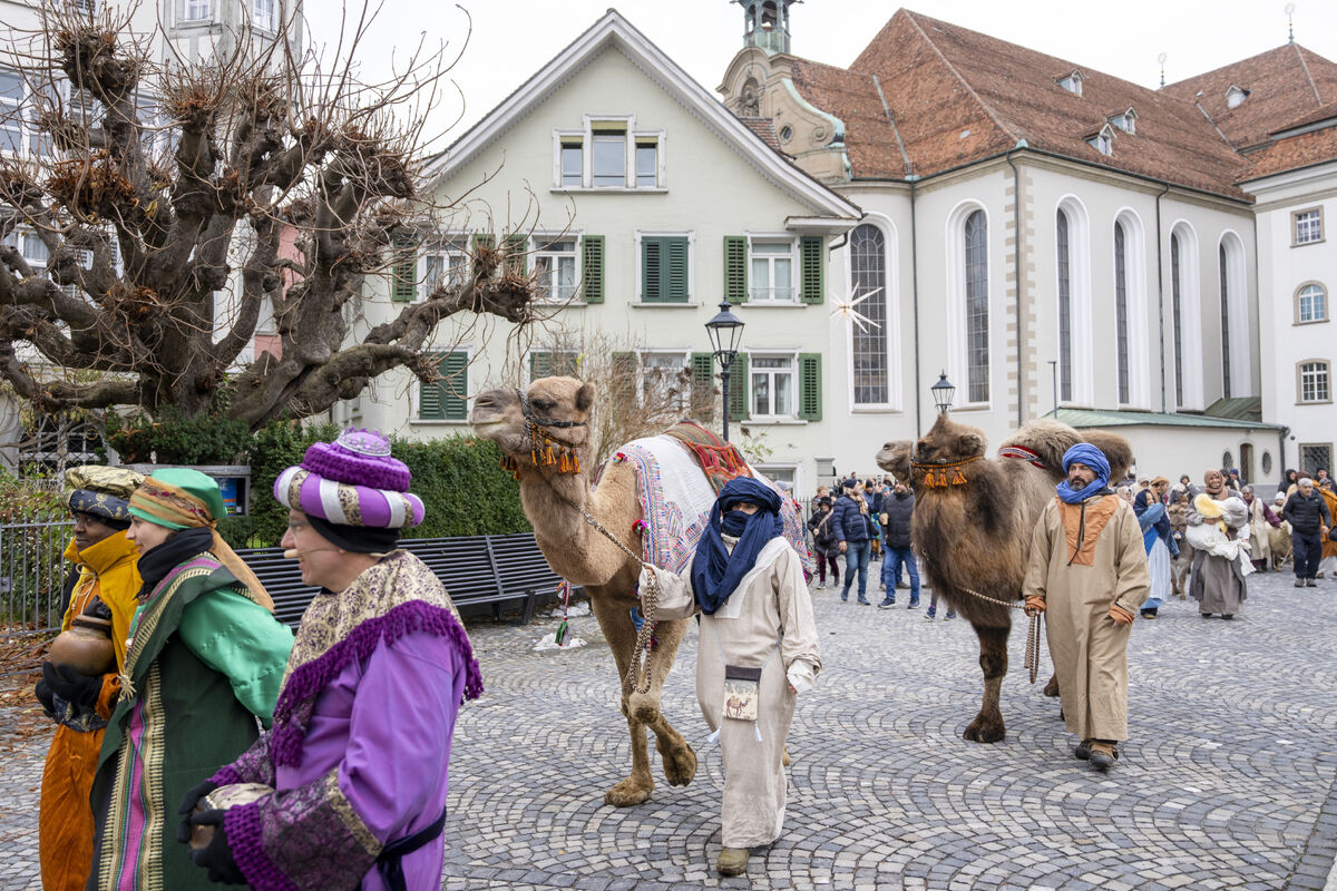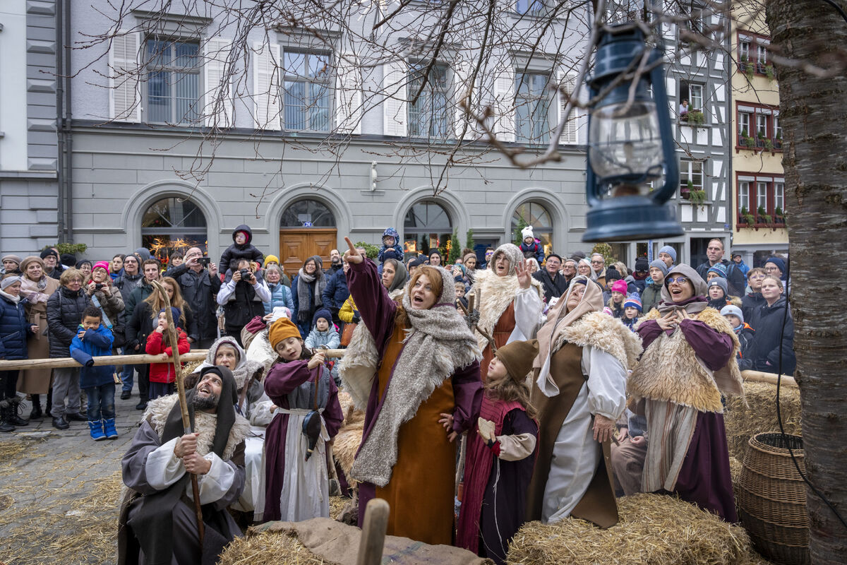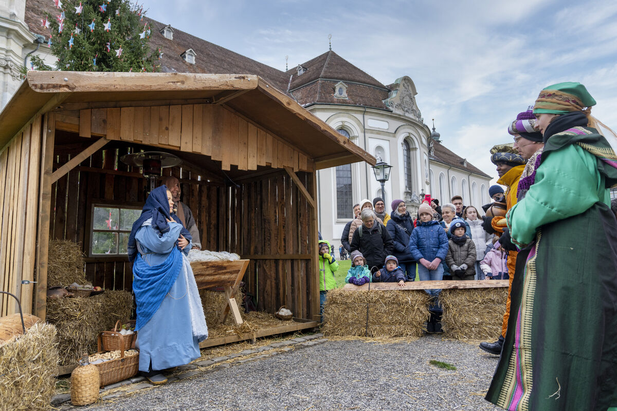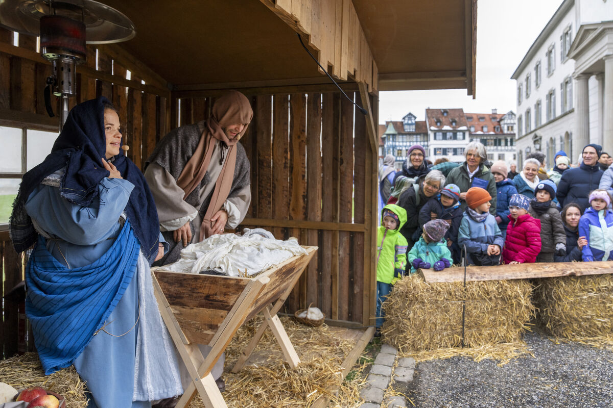 Bei gutem Wetter und vor grossem Publikum ist an drei Standorten in der St. Galler Innenstadt die Weihnachtsgeschichte aufgeführt werden.