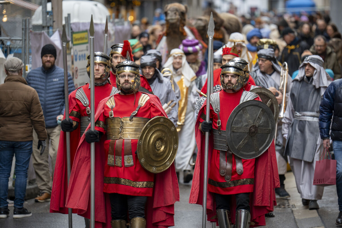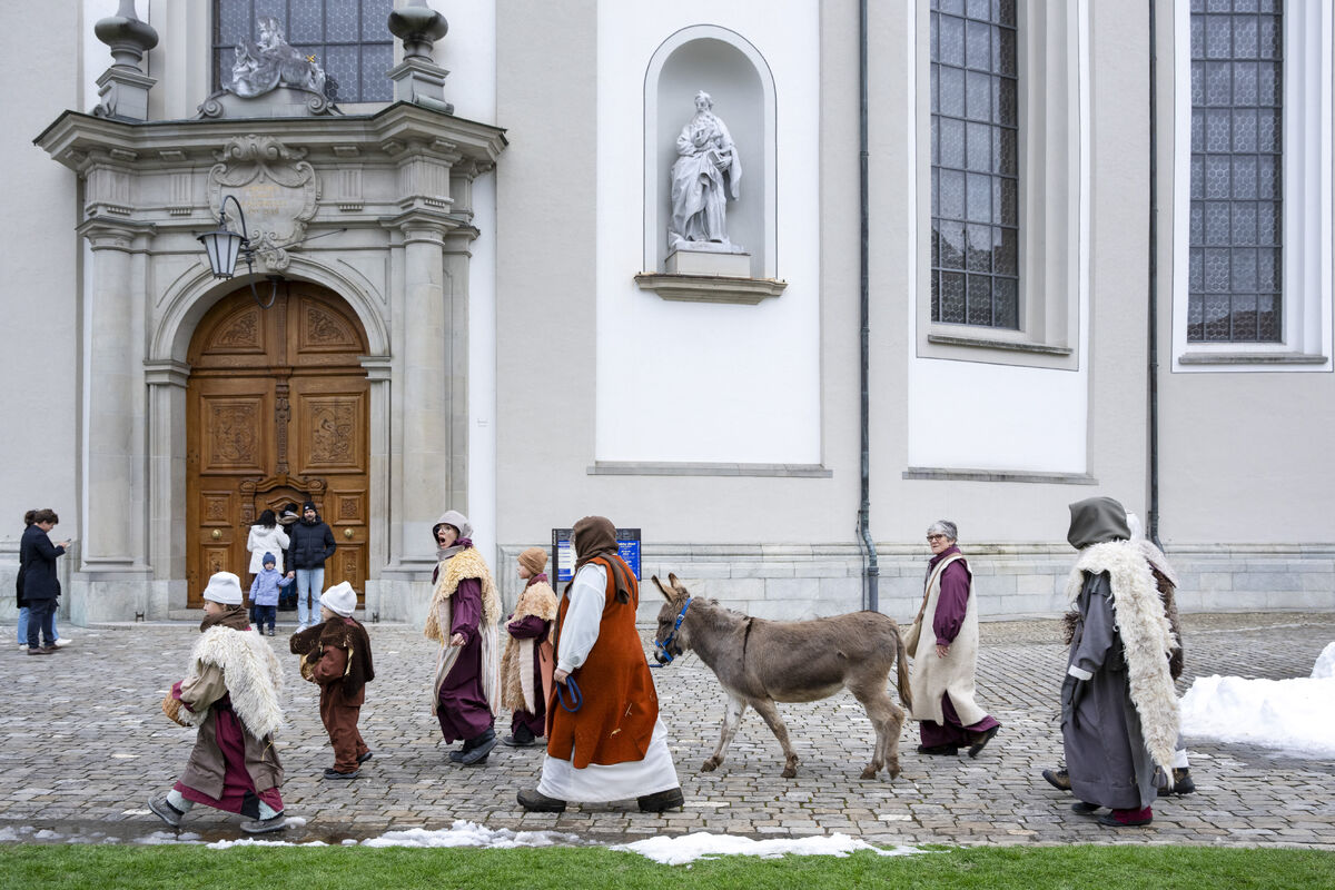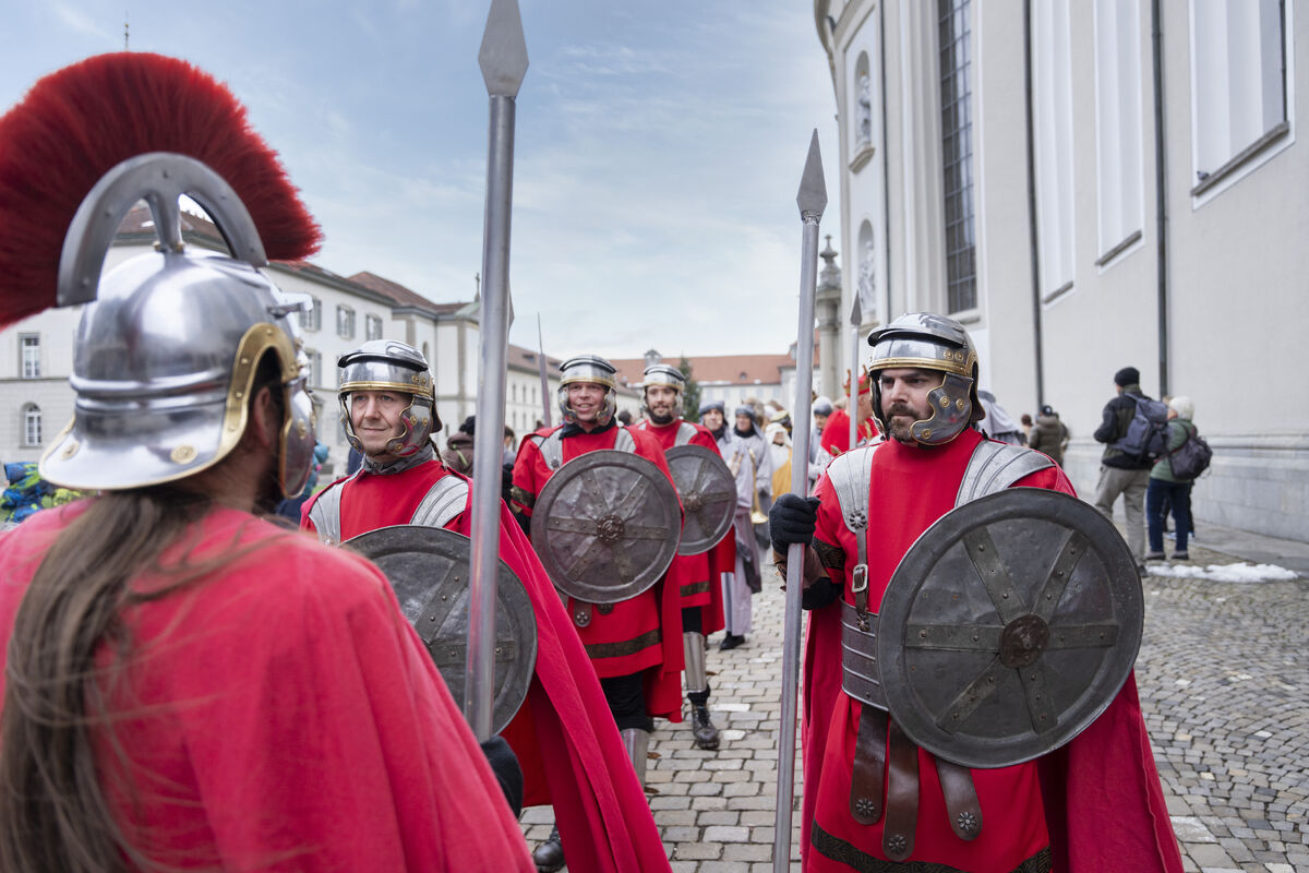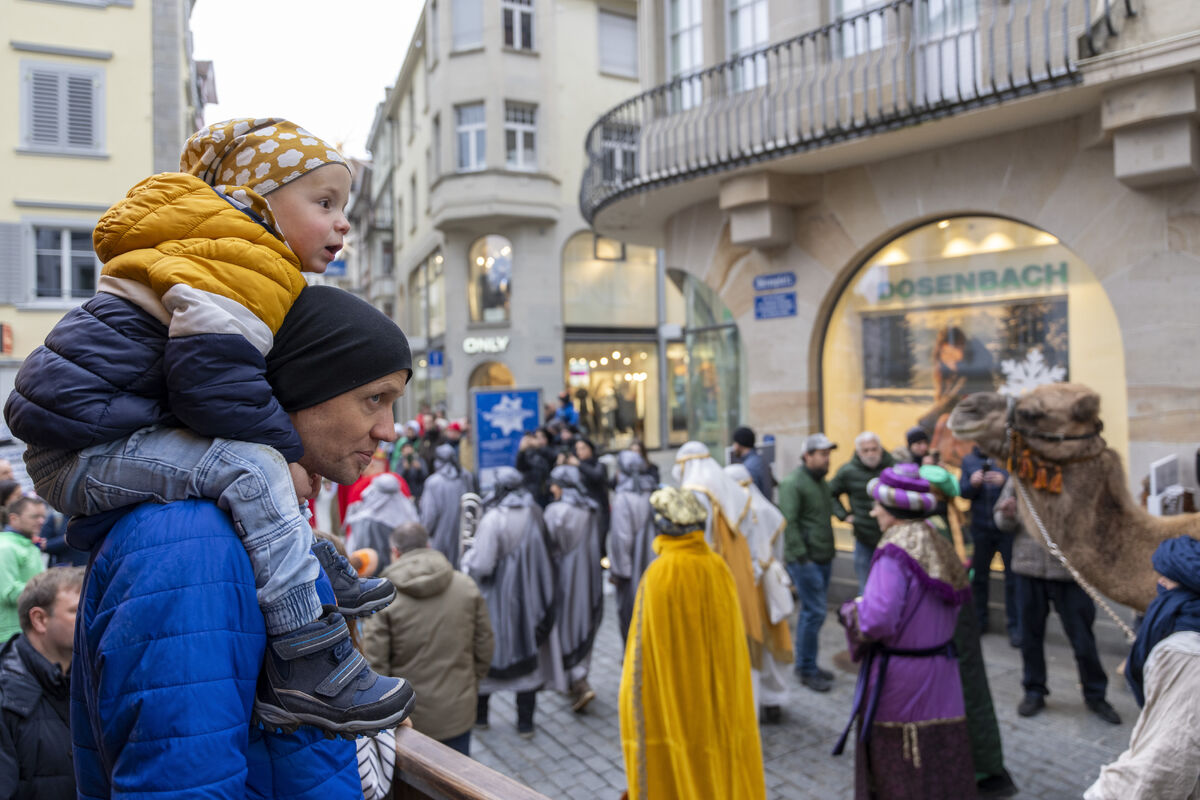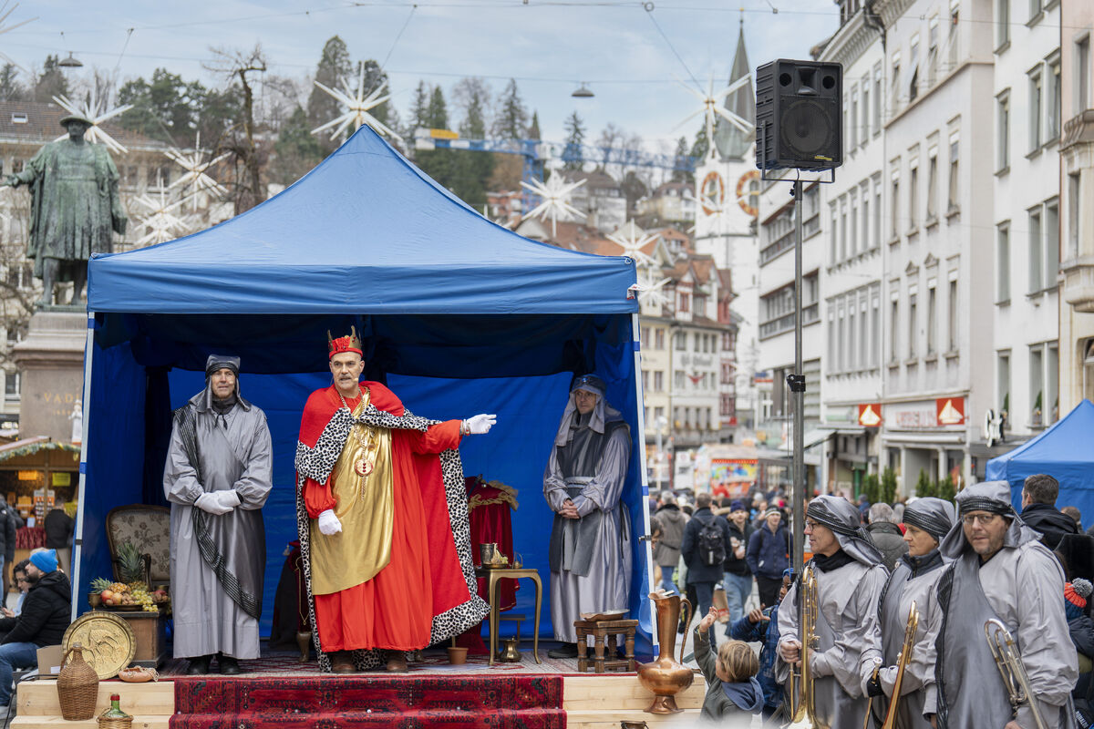 Bei gutem Wetter und vor grossem Publikum ist an drei Standorten in der St. Galler Innenstadt die Weihnachtsgeschichte aufgeführt werden.