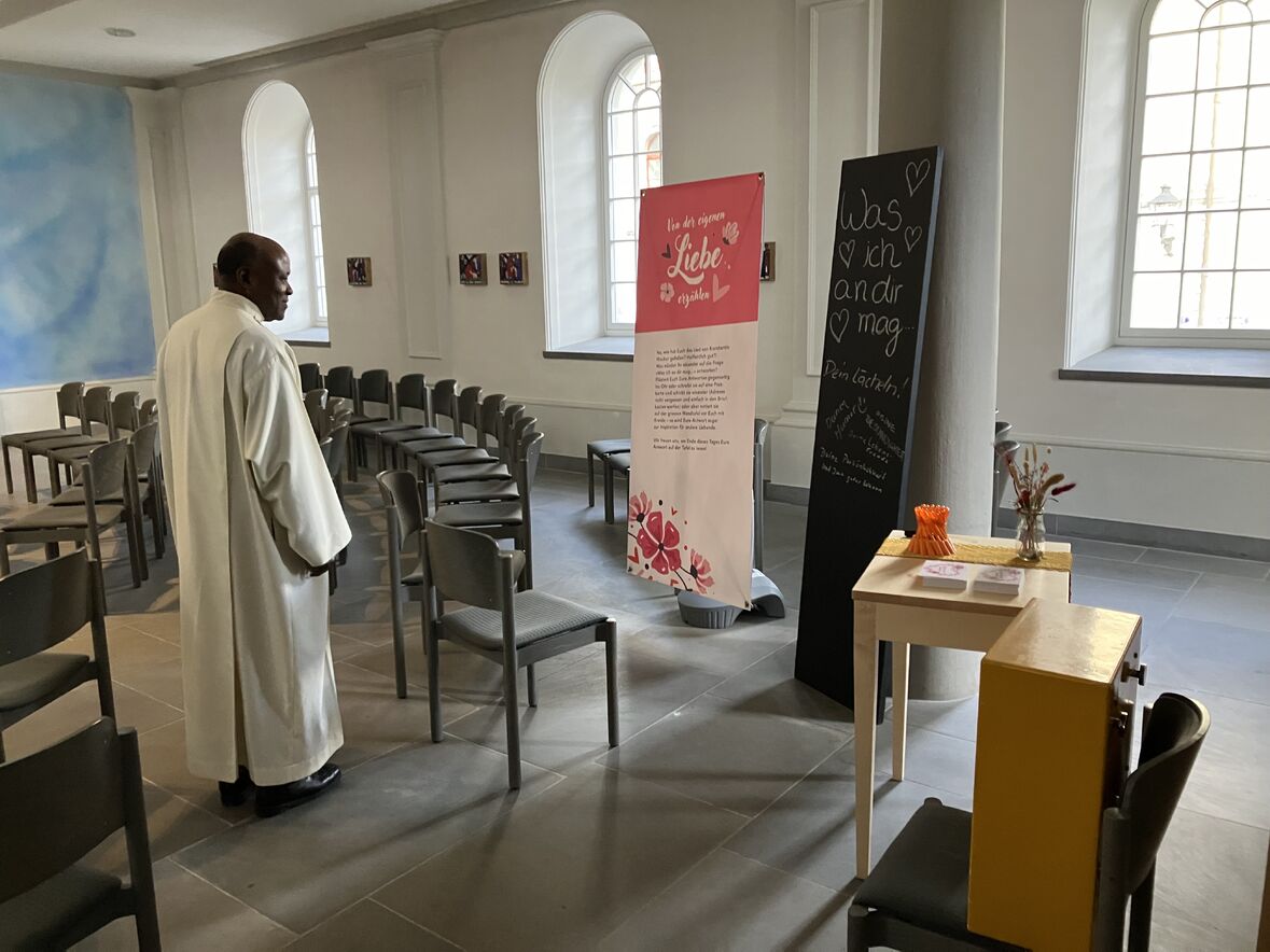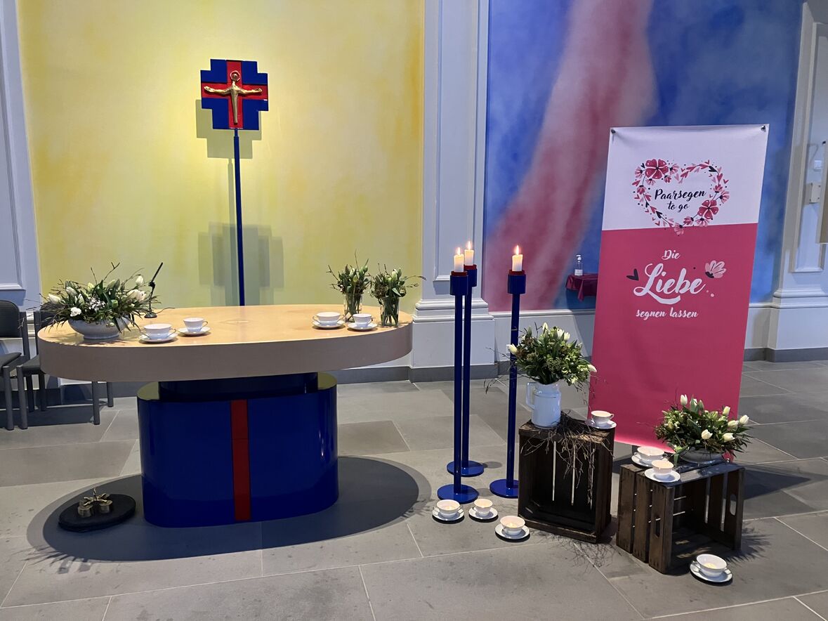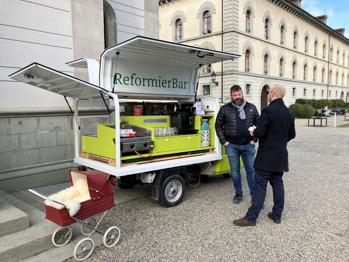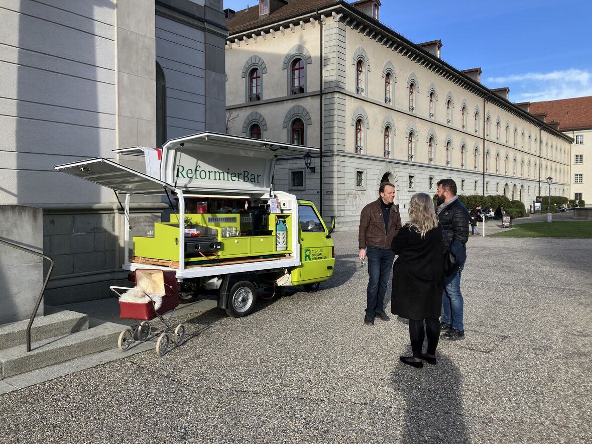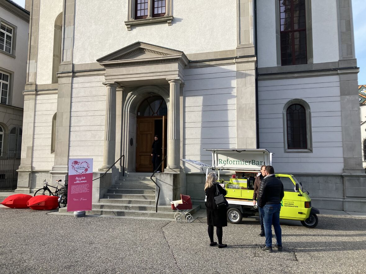 Vor der Schutzengelkapelle wurden Interessierte an der ReformierBar willkommen geheissen und für ihren Besuch der Stationen in der Schutzengelkapelle gebrieft. Dort konnten sie auch einen individuellen Paarsegen to go empfangen.