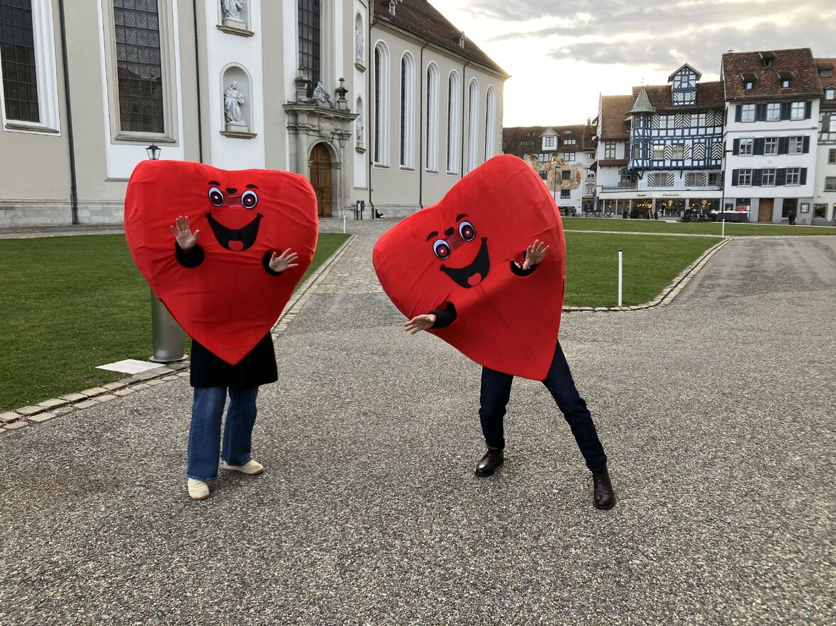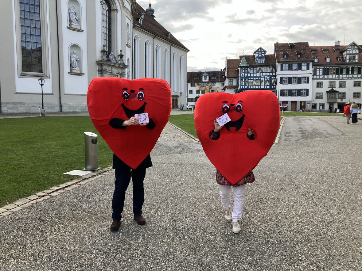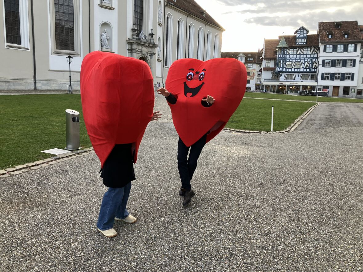 Der Aschermittwoch stand dieses Jahr in der Schutzengelkapelle ganz im Zeichen der Liebe - denn am gleichen Tag war ja auch Valentinstag! Als Herzen verkleidet tanzten und schlenderten Freiwillige und Mitarbeitende durch die Strassen der Innenstadt, um mit Flyern auf das Angebot zum Valentinstag in der Schutzengelkapelle aufmerksam zu machen. Natürlich waren unsere Herzen der Publikumsliebling der Passant:innen in der Innenstadt - als Fotomodelle und für Free Hugs.