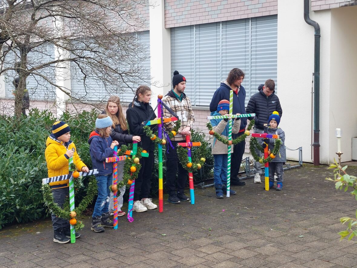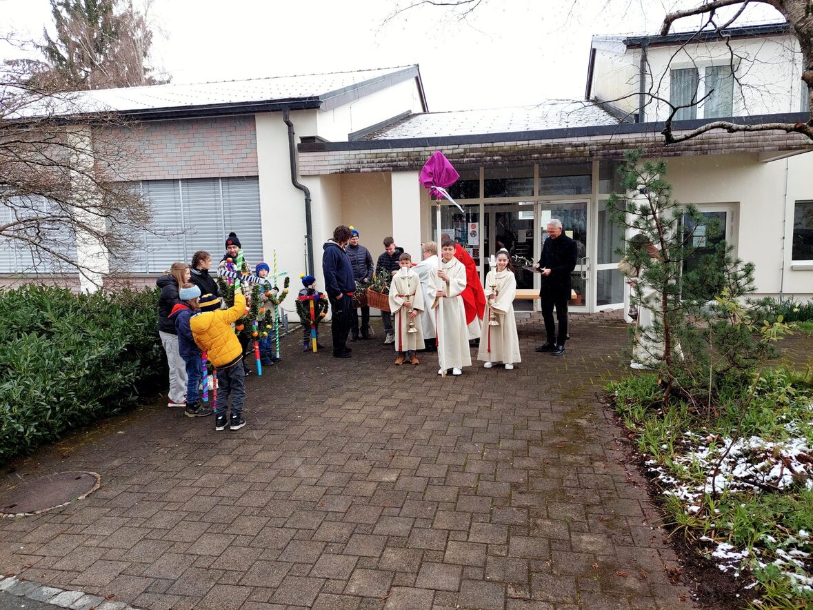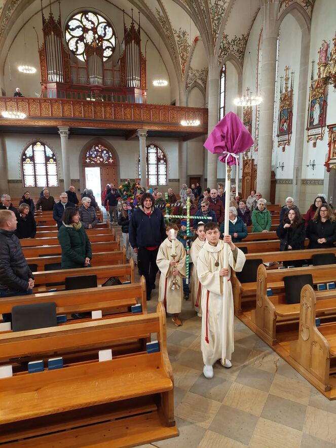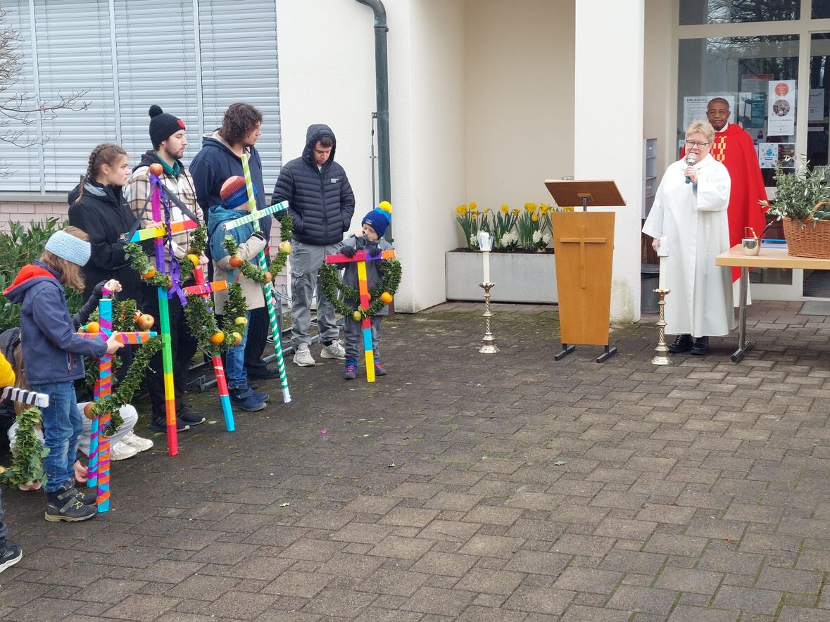 Zur Erinnerung an den Einzug in Jerusalem haben Kinder zusammen mit den JUBLA Leitern am Samstagnachmittag Palmkreuze gebunden. Diese wurden von ihnen am Sonntag zu Beginn des Gottesdienstes bei einem feierlichen Einzug in die Kirche getragen. Im Gottesdienst wurden Palmzweige gesegnet, die im Anschluss nach Hause genommen werden konnten.