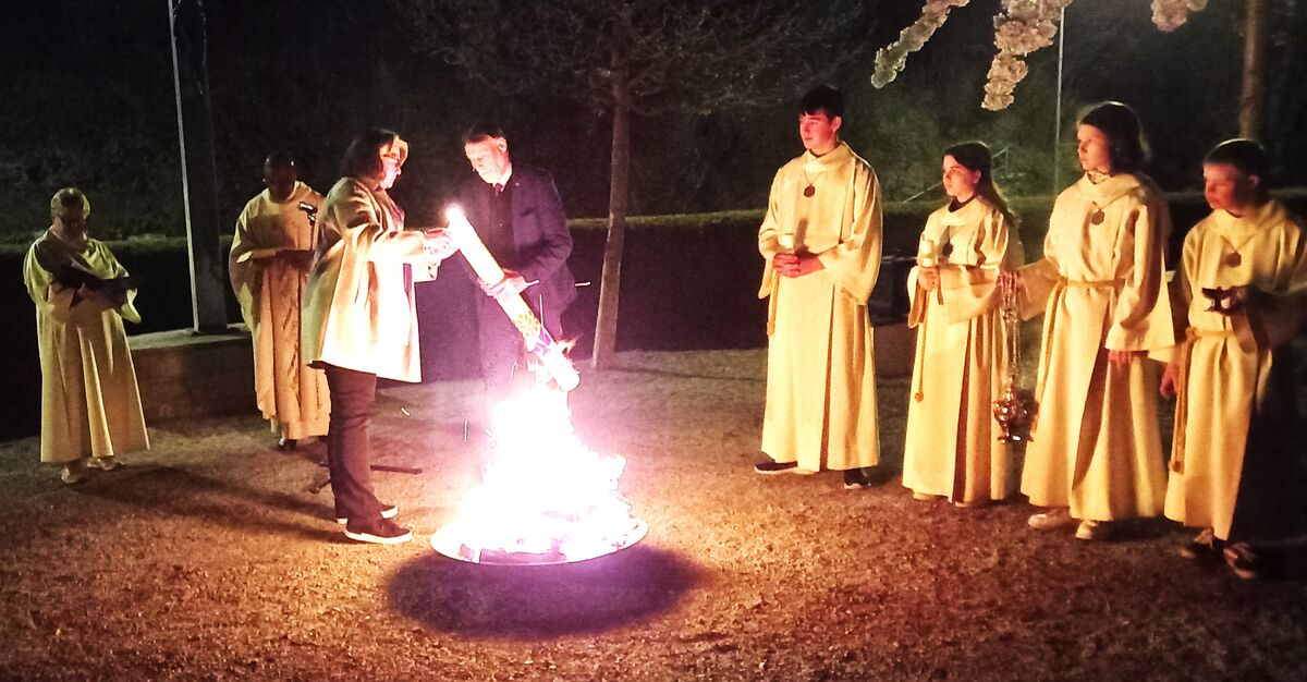 Am Ostersamstag wurde nach Einbruch der Dunkelheit die Osternachtsfeier am Osterfeuer eröffnet. Nach der Segnung des Feuers und der Osterkerze zogen viele Gläubige und nach ihnen das Licht in die Kirche ein. Mit dem Licht und dem Wasser standen die beiden wichtigsten Symbole der Auferstehung im Zentrum des Gottesdienstes. Musikalisch umrahmt wurde die Feier von Joachim Oberholzer (Orgel und Gesang) und Manuela Meyer (Querflöte).