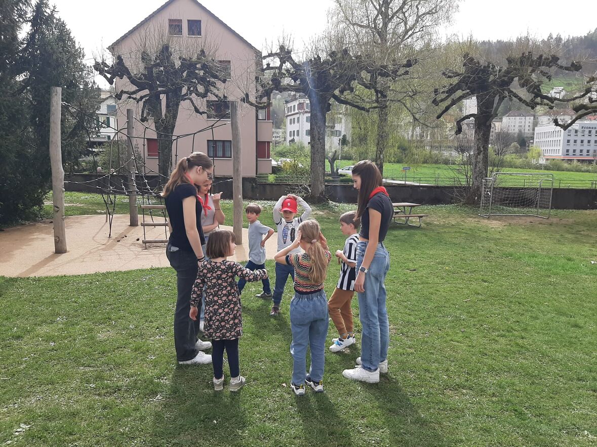 Nach dem Begrüssen der Kinder schauten wir uns das spannende Theater der Jungleiter an. Danach gestalteten wir das Türplakat mit unseren Handabdrücken und Bildern. Bis zum Mittagessen spielten wir draussen viele verschiedene Spiele, wie zum Beispiel Fussball, Komm mit geh weg und bastelten Blumenkränze. Zum Mittagessen gab es Cinque Pi, welches sehr lecker war. Am Nachmittag ging es weiter mit dem Pflanzen von Kresse, wir sind sehr gespannt wie viele es am Donnerstag gewachsen sein wird. Danach spielten wir viele verschiedenen Spiel im grossen Saal. Den Tag beendeten wir mit dem singen einiger Lieder und verabschiedeten die Kinder nach einem erlebnisreichen Tag.