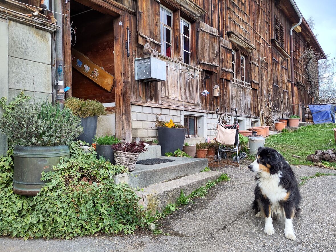 Hofhund Bruno begrüsst die Besucherinnen und Besucher.