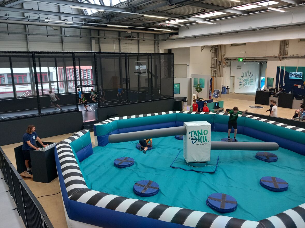 Zwei Stunden lang habe sich die Jugendlichen und Jugendarbeiter sportlich verausgabt beim Trampolinspringen, Fussball spielen auf den weichen Matten oder beim Durchhangeln auf dem Ninja-Parcours.