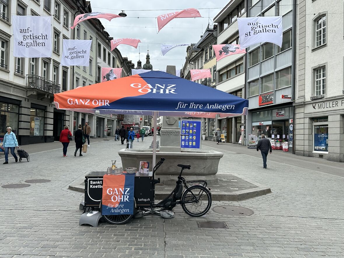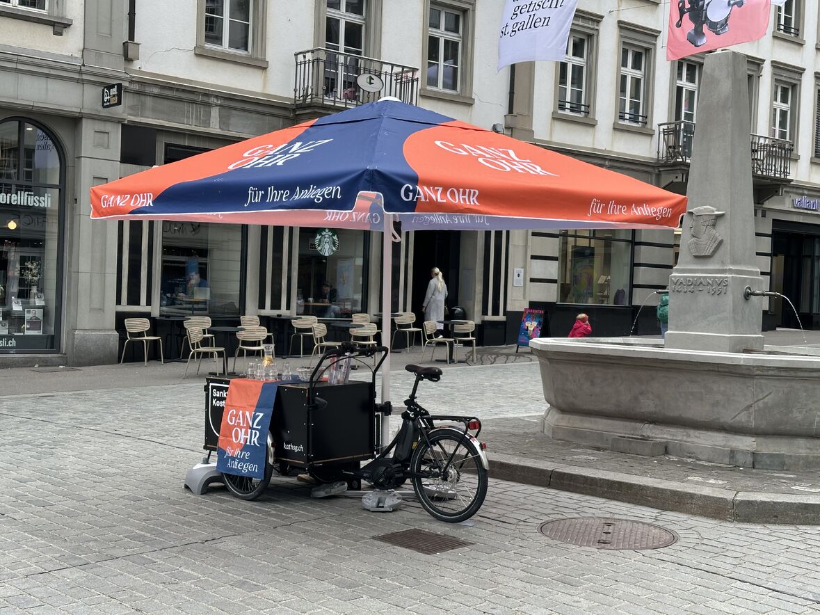 Am Freitag, 3. Mai, sind wir wieder mit unserem Ganz-Ohr-Stand auf dem Bauernmarkt gestartet. Trotz der Grossbaustelle am Marktplatz und drum herum, konnten wir uns mit der KostBar am Rande des Bauernmarktes gleich gegenüber des Vadian-Denkmals platzieren. Mit Ganz-Ohr auf dem Bauernmarkt versucht das ökumenische Team von Seelsorgenden und Sozialdiakonen ein niedrigschwelliges Seelsorgeangebot zu schaffen, das Menschen eben ein offenes Ohr für ihre Anliegen bieten soll. Am Freitag, 17. Mai, sind wir wieder auf dem Bauernmarkt.