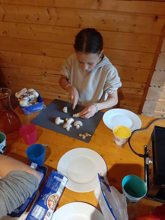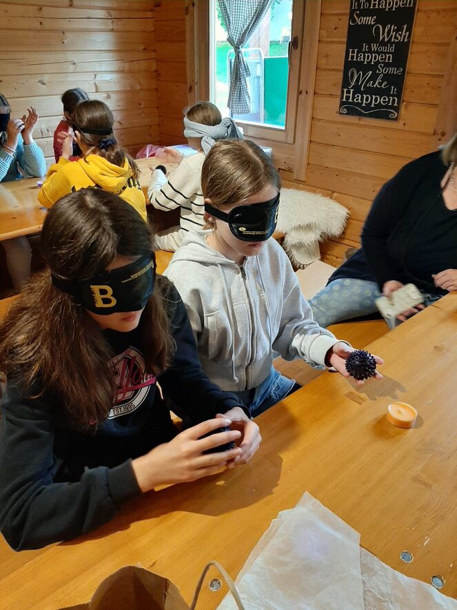 (Jugendarbeiterin Katholische Kirche) mit verschiedenen Mädchen in der Villa Donkey in Degersheim. Sie führten mit den Jugendlichen eine blinde Verköstigung durch, bei der sie herausfinden mussten, was sie gerade blind gegessen hatten. Sie hatten auch die Aufgabe herauszufinden, was in einem Glas war, indem sie nur das Geräusch hörten. Nicht nur das gehörte zu unserem Programm : die Mädchen haben auch jeweils das Abendessen sowie das Frühstück zubereitet.