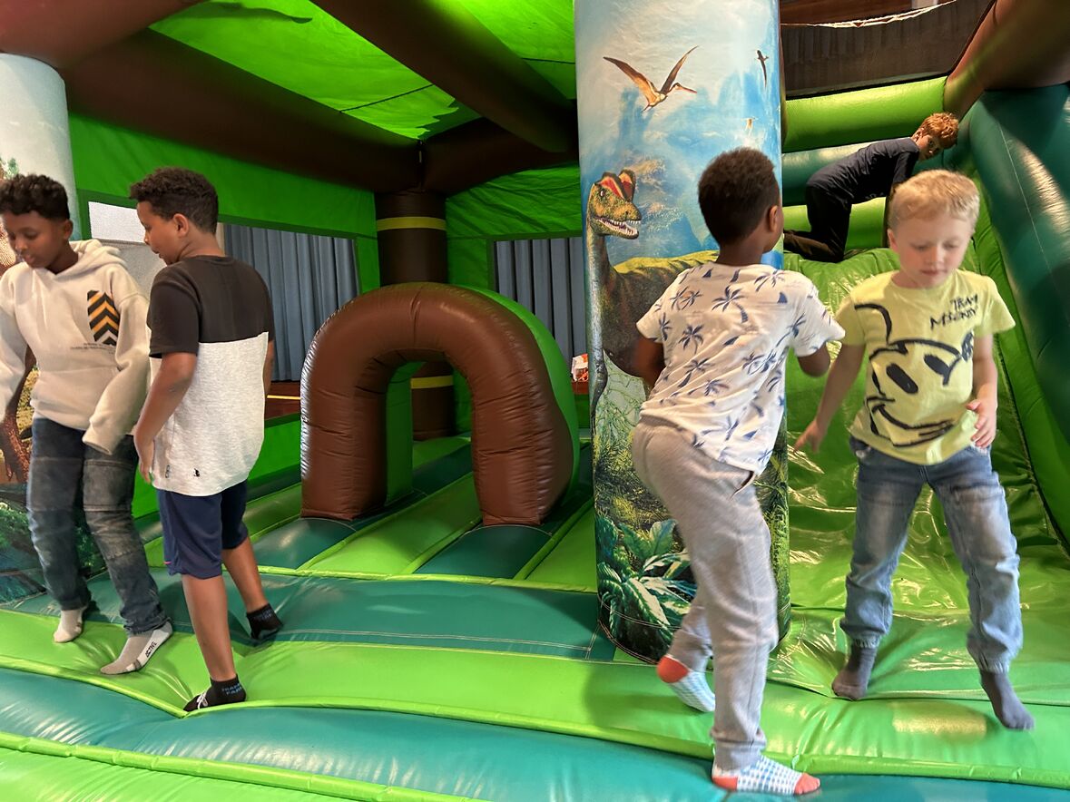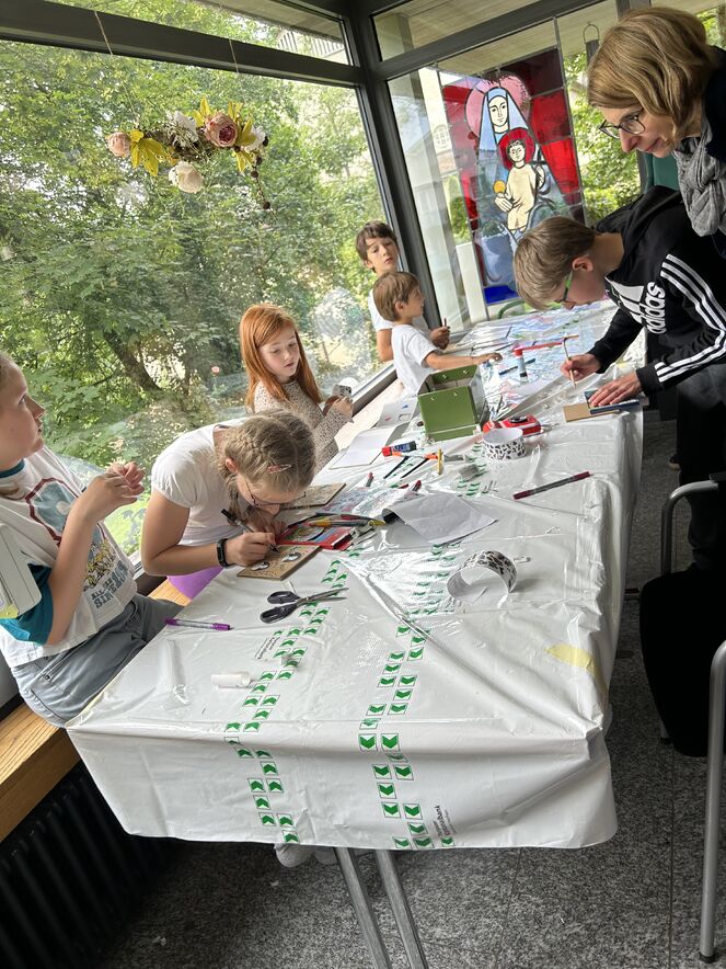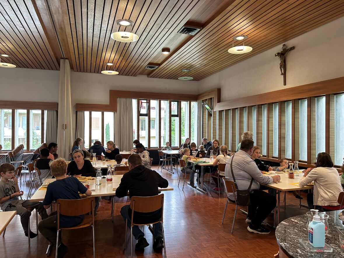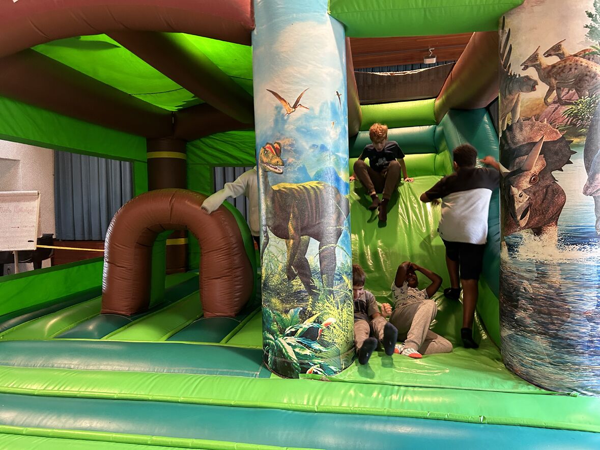 Bei einem kleinen Theater und der Gestaltung eines Familienbüchlens mit dem Bezug auf das " Vater unser." waren wieder alle mit viel Fanatasie und Begeisterung dabei. Das gemeinsame Mittagessen mit Pommes und Chiggen Nuggets wurde wegen des schlechten Wetters im Pfarreisaal eingenommen. Super war unsere Hüpfburg, die genau in den Saal passte und rege ausprobiert wurde.
