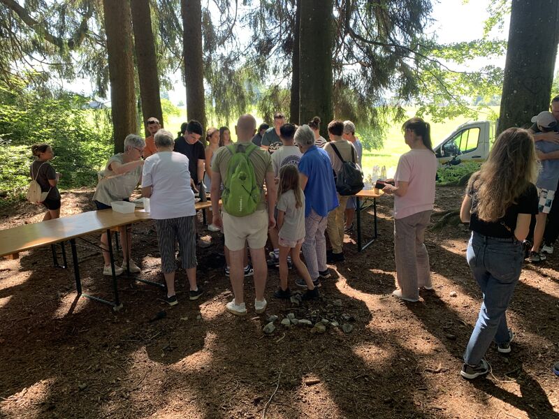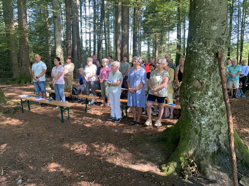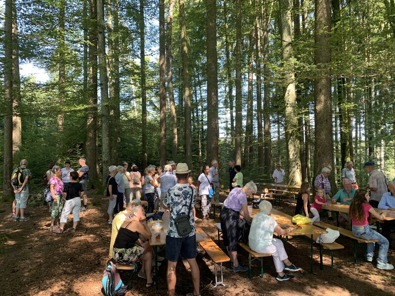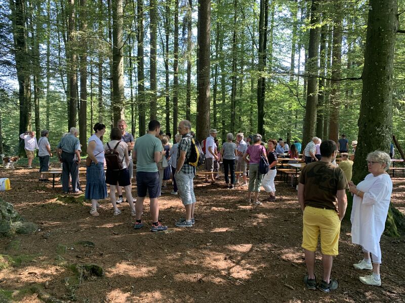 Gemeinsam mit den Abtwilerinnen und Abtwiler feierten wir zum Ferienende oder Schuljahrbeginn bei schönem Wetter den Gottesdienst beim Schlangenbaum.