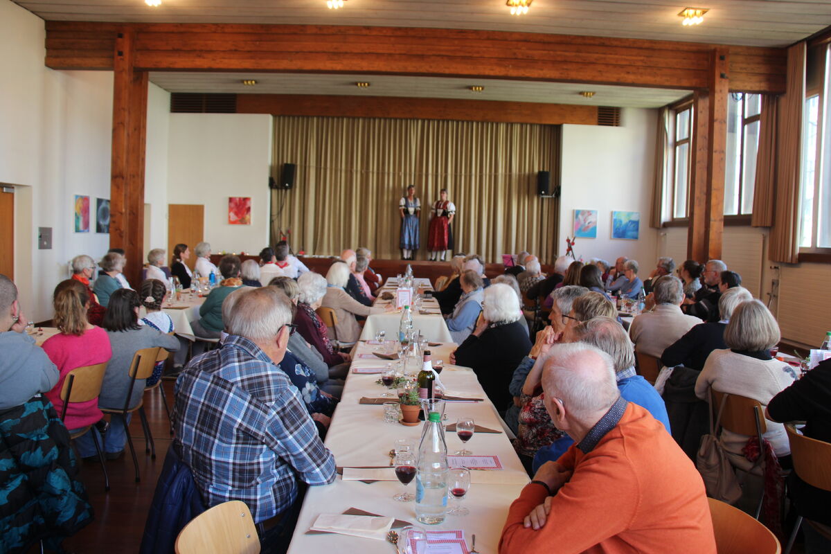"Heimat" war diesmal das Thema. Dieses zog sich vom Apéro, einem Käse-Fleisch-Plättli durch das ganze Menü. Auch das Unterhaltungsprogramm passte dazu: eine junge Hackbrett-Spielerin, zwei Jodlerinnen, und der Sketch des Pfarreiteams.