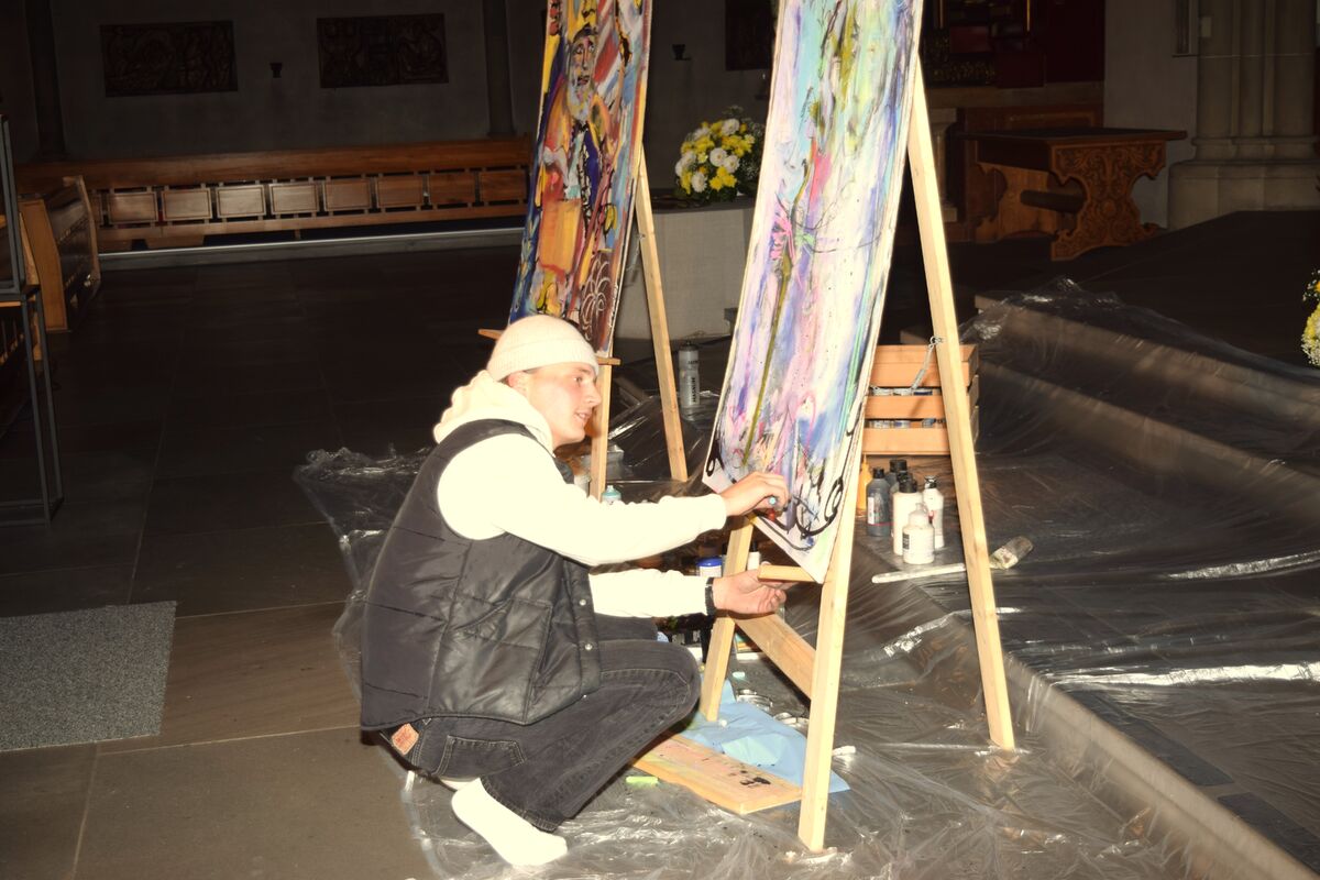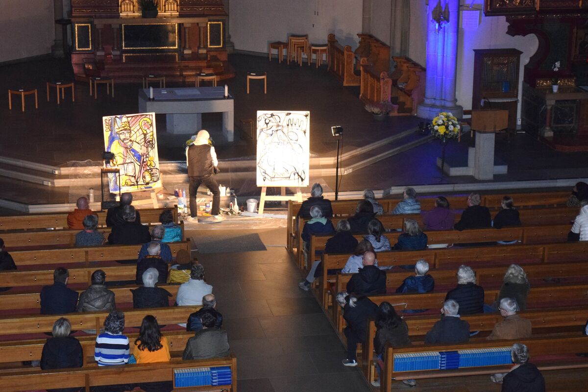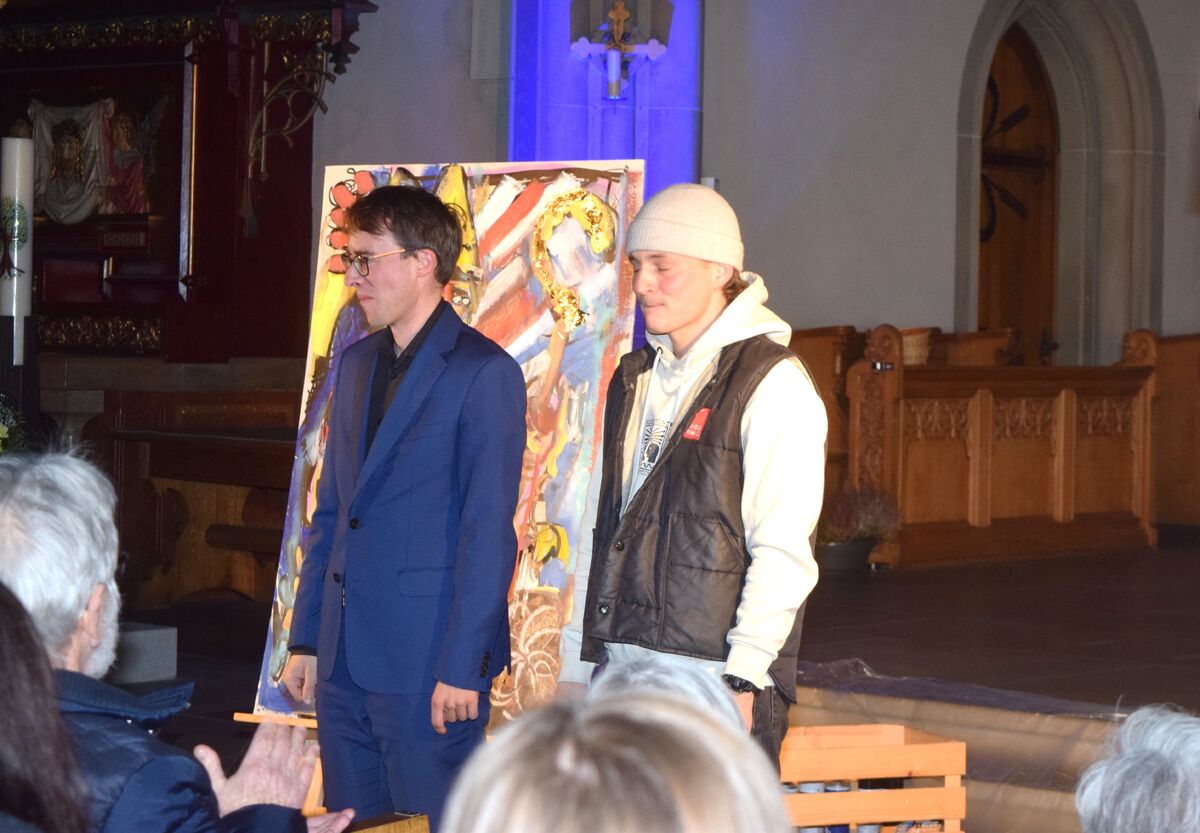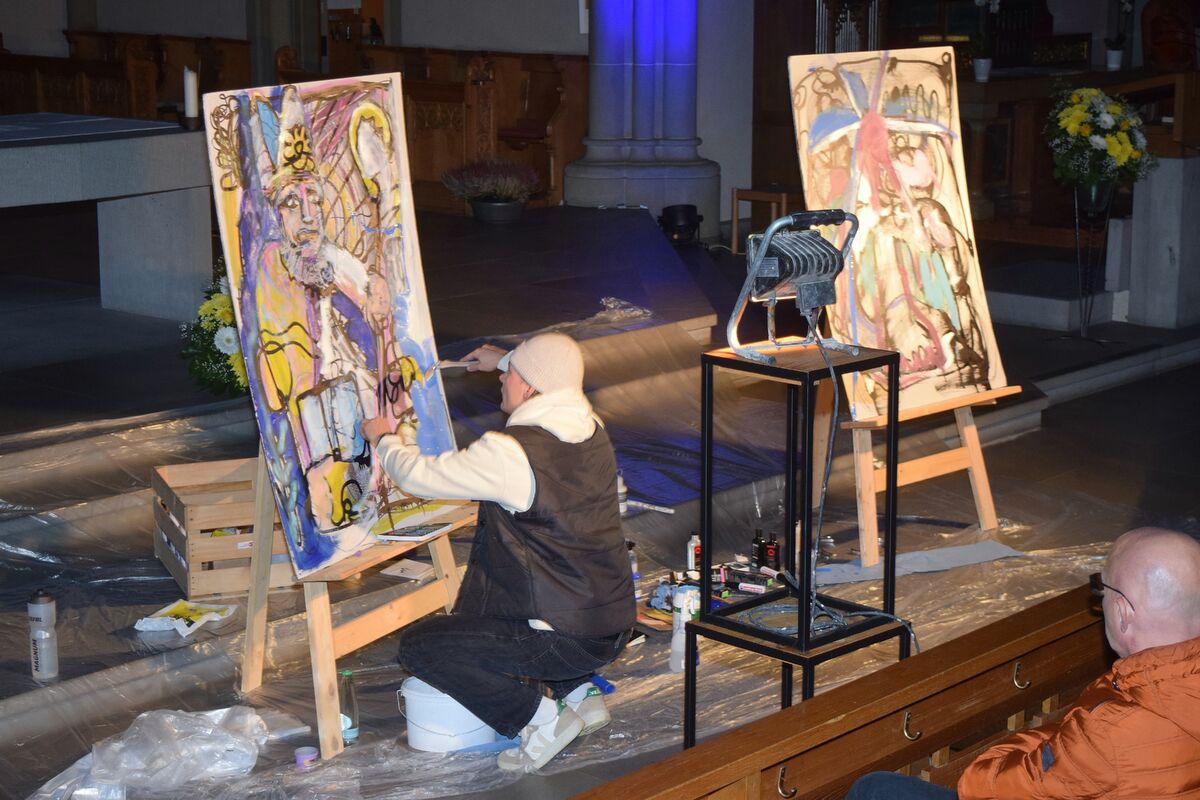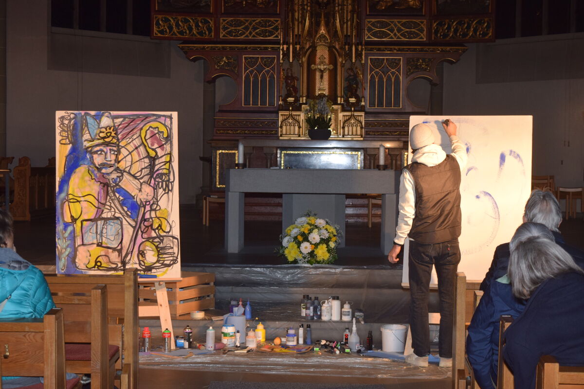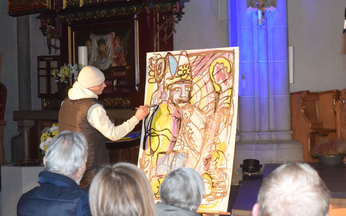«Farbenklänge» heisst das aussergewöhnliche Kunstprojekt, das am zweitletzten November-Wochenende in der Otmar-Kirche stattgefunden hat. Farben und Klänge suchten gemeinsame Wege. Das Malen mit Pinseln, Spraydosen und Filzstiften übernahm der Schaffhauser Malkünstler Keanu Rehter. Über ein Stunde lang liess er sich pausenlos treiben von der Musik des Organisten Johannes Lienhart. Die beiden haben sich gegenseitig inspiriert und etwas Einmaliges entstehen lassen. Über 100 Zuschauer haben sich dieses Experiment nicht entgehen lassen und zugeschaut, wie in diesen Momenten zwei Bilder entstanden. Eines davon zeigt den Heiligen Otmar. Es kann erworben werden.