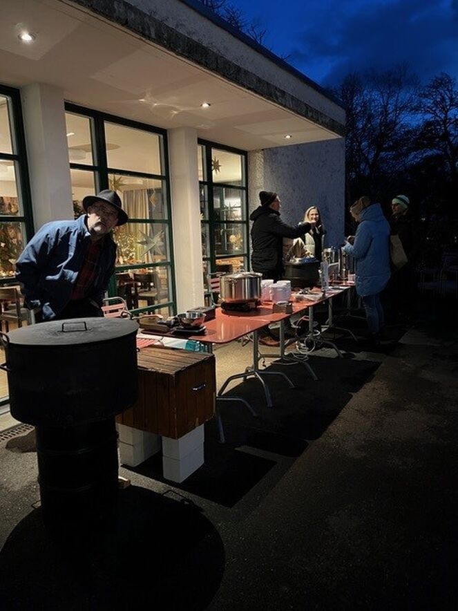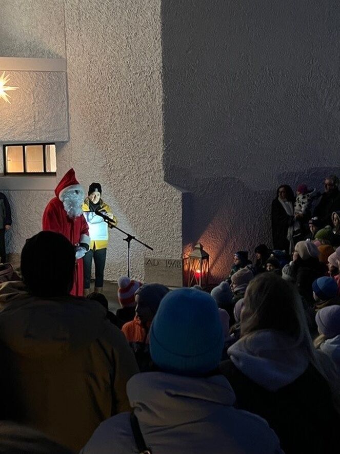 Bilder von früheren Adventslaternen-Geschichten werden an die Kirchenwand projiziert. Vor dem Pfarreiheim wird das Buffet gerichtet mit Punsch, Glühwein, Maroni, Gulasch- oder Kürbissuppe. Mittlerweile sitzen auf den Bänken vor dem Kircheneingang 99 Kinder. Gespannt hören sie der Geschichte des Samichlaus zu, der mit Schmutzli und Esel ankam. Und unten im Saal verzieren sie anschliessend ihr Lebkuchenherz.