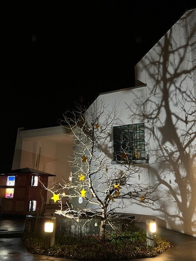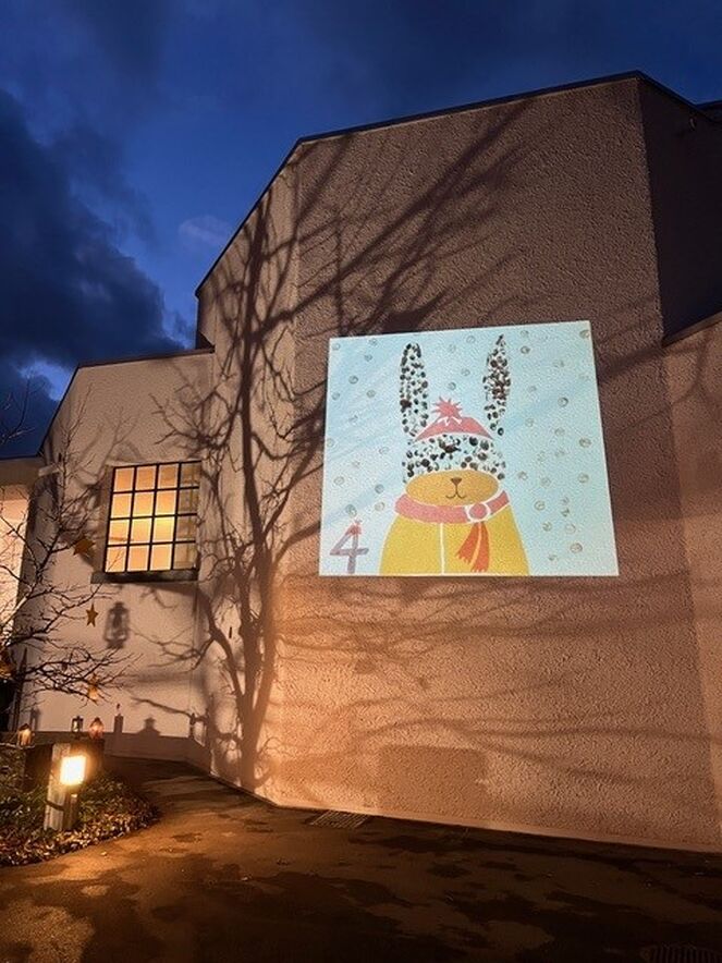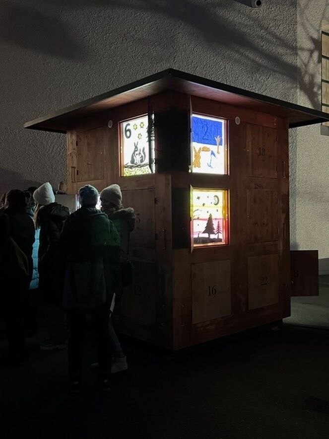 Ein stimmungsvoller Abend auf dem Kirchplatz Rotmonten. An der Adventslaterne leuchten die ersten sechs offenen Fenster.