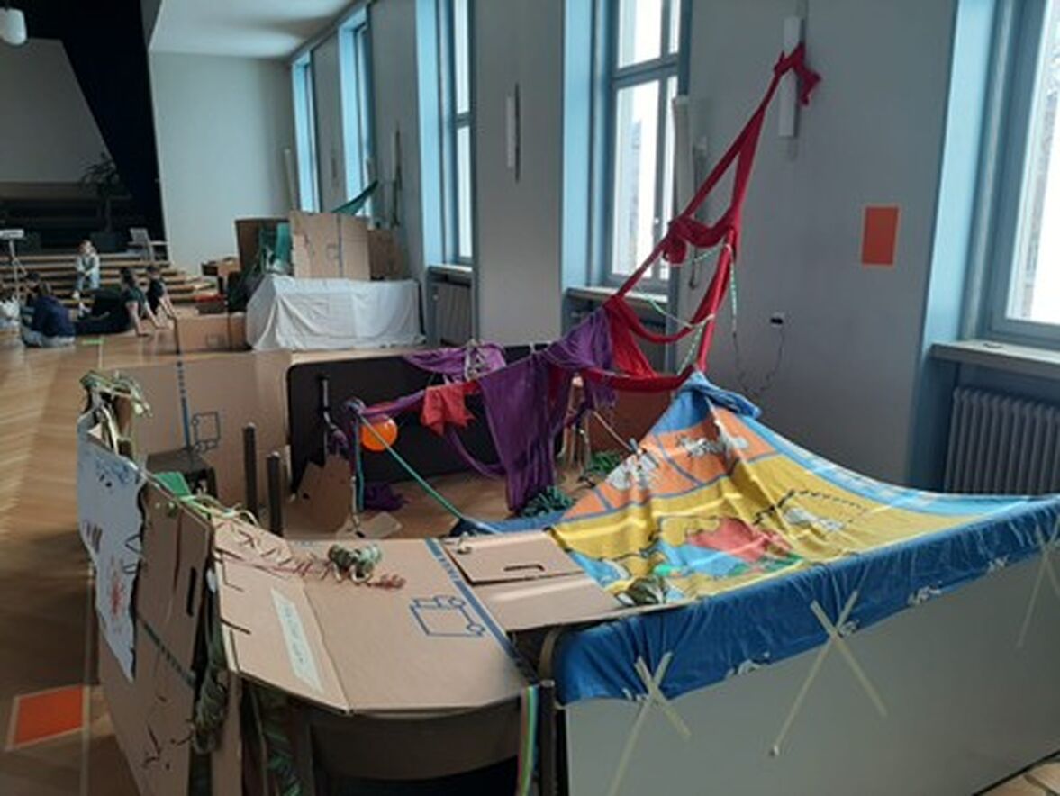 Für jeden absolvierten Posten gab es einen Punkt und mit diesen Punkten durften die Kinder anschliessend Baumaterialien „einkaufen“. Von Karton über Schnur, Bettlaken, Tücher bis hin zu Tischen war alles dabei. Gemeinsam mit den Jungleitenden machten sich die Gruppen dann hochmotiviert ans Werk.