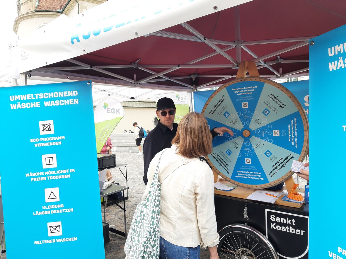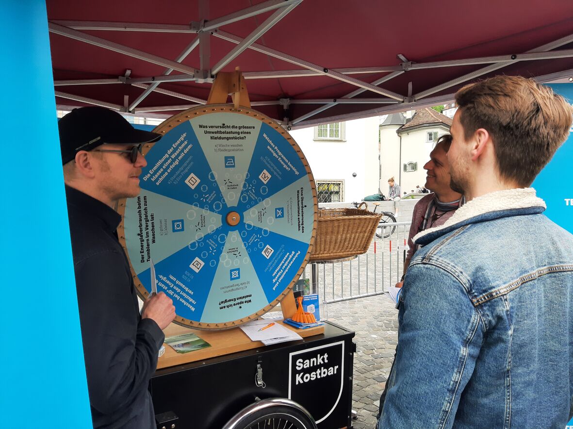 Am diesjährigen Ökomarkt drehte sich am rege besuchten Infostand der Cityseelsorge alles ums umweltschonende Waschen. Die Standbesuchenden erhielten einfach umsetzbare Tipps, wie sie das Wäsche waschen umweltschonender gestalten können. Fragen wie warum das Eco-Programm trotz längerer Laufzeit umweltschonender ist oder was die Vorzüge von Pulver- gegenüber Flüssigwaschmittel sind, führten zu angeregten Diskussionen mit oftmals vielen Aha-Effekten. Beim Glücksrad konnten die Besuchenden ihr Wissen testen und im Gespräch vertiefen. Eine eigens für diesen Anlass erarbeitete Broschüre wurde den Besuchenden, zusammen mit einer Fleckenseife, als Geschenk überreicht.