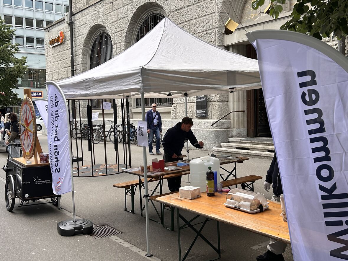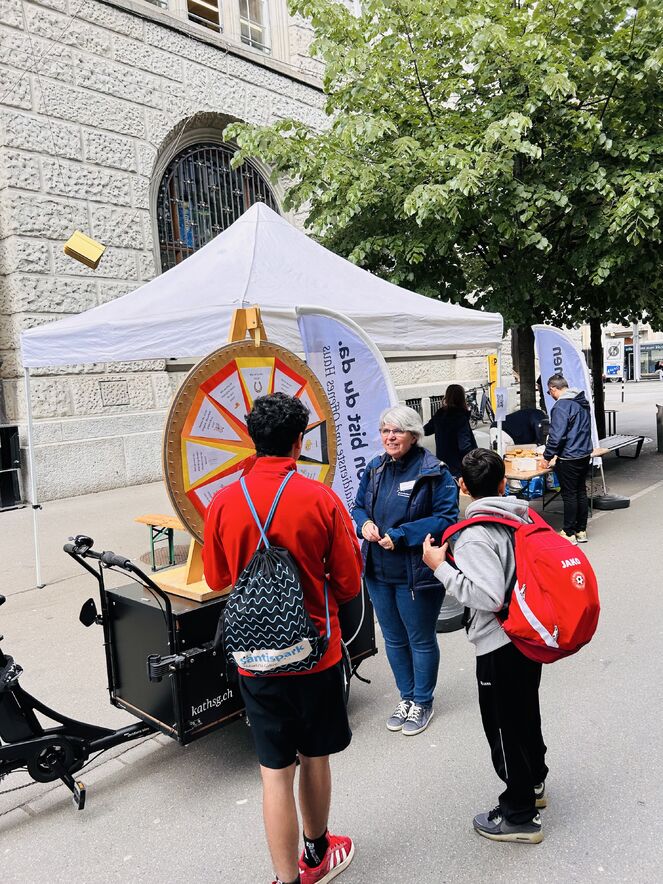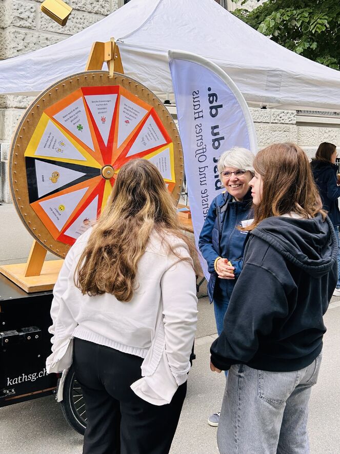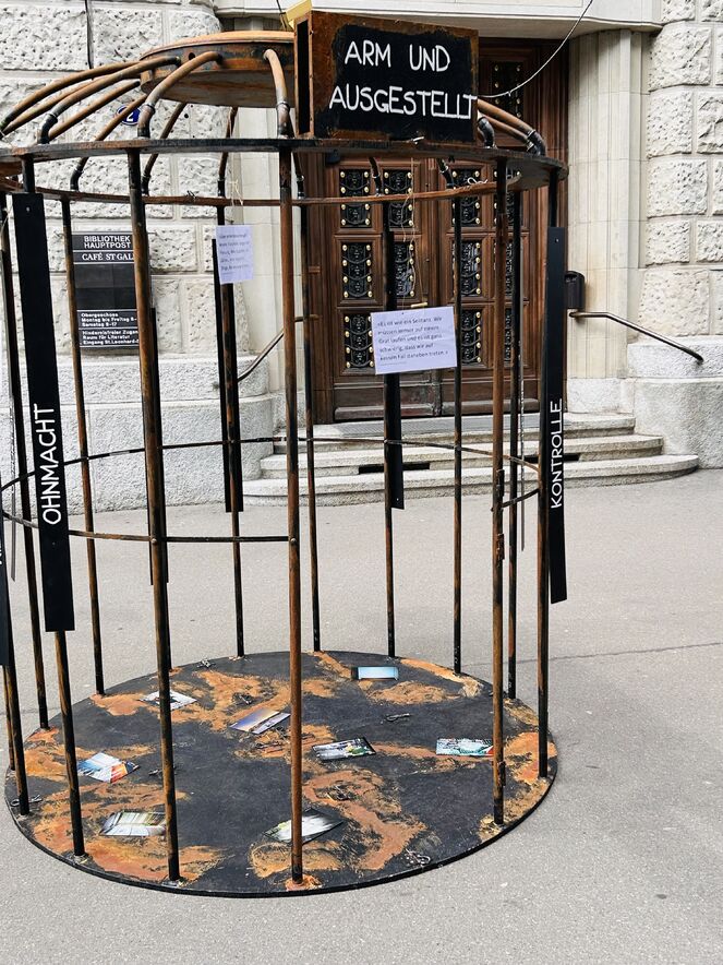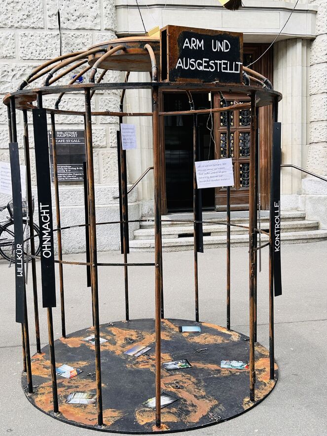 Mit einer gemeinsamen Standaktion haben die kirchlichen Sozialdienste von St. Gallen und Wittenbach auf das Thema «Armut» aufmerksam gemacht. Mit dem «Armutskäfig» und einem Glücksrad wurden zahlreiche Passantinnen und Passanten vor der Hauptpost in St. Gallen erreicht.