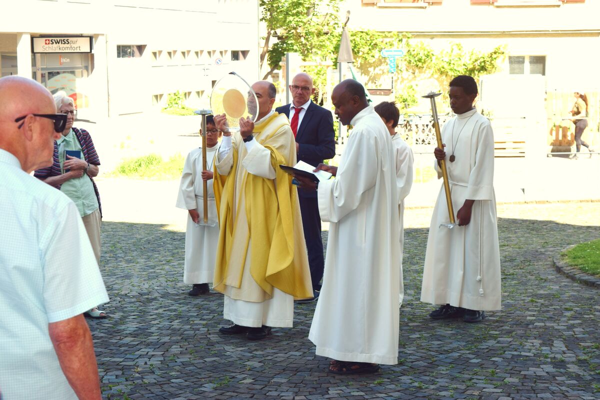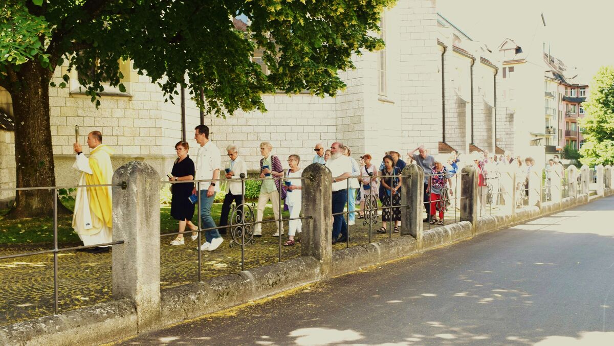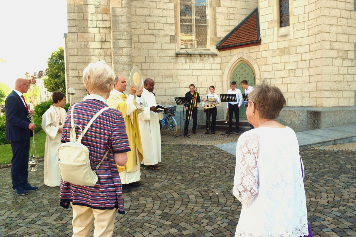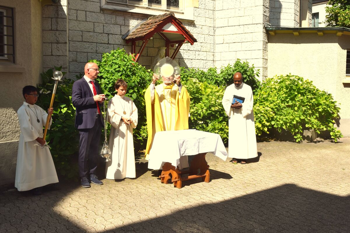 Bei strahlendem Sonnenschein feierte die Pfarrei St. Otmar Fronleichnam. Nach dem Gottesdienst waren die Gläubigen zur Fronleichnamsprozession rund um die Kirche eingeladen. Der Gottesdienst und die anschliessende Prozession wurde musikalisch durch Blechbläser umrahmt.
