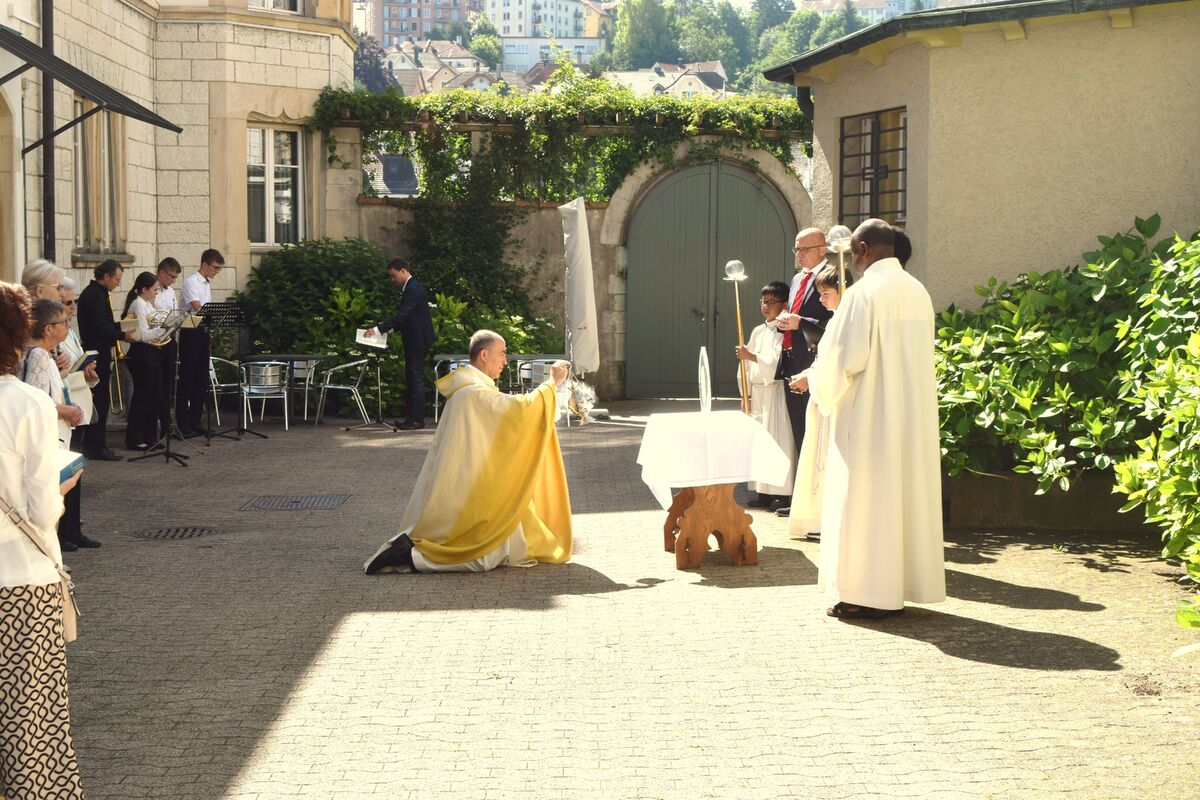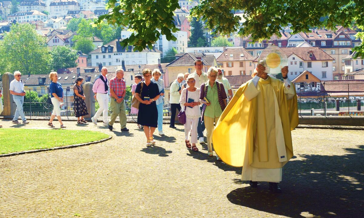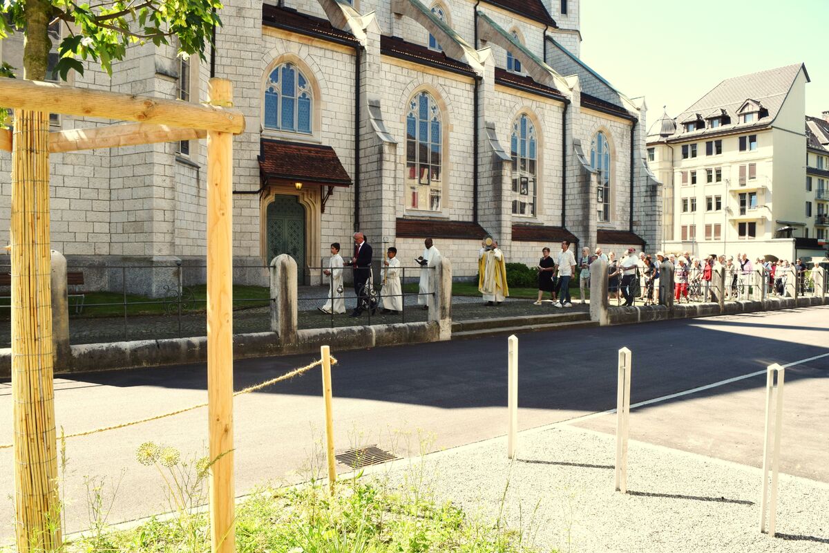 Bei strahlendem Sonnenschein feierte die Pfarrei St. Otmar Fronleichnam. Nach dem Gottesdienst waren die Gläubigen zur Fronleichnamsprozession rund um die Kirche eingeladen. Der Gottesdienst und die anschliessende Prozession wurde musikalisch durch Blechbläser umrahmt.