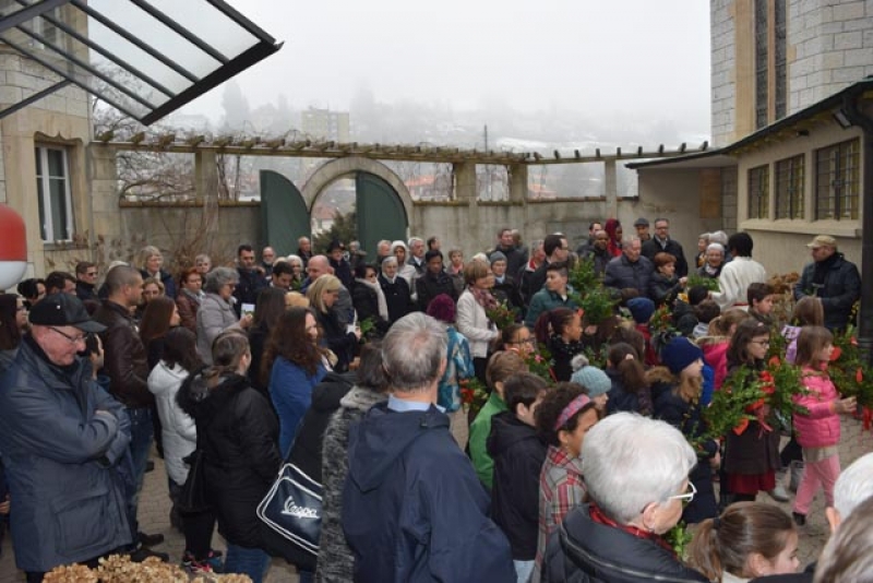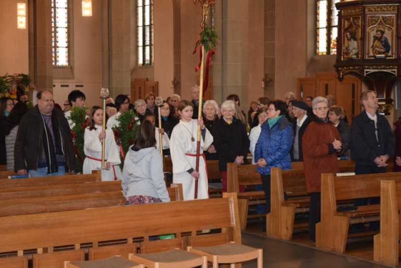 Im Familiengottesdienst an Palmsonntag wurde fröhlich gesungen und gejubelt! Erstkommunionkinder hatten zusammen mit ihren Eltern Palmsträusschen gebunden und zum Jubelruf im Gottesdienst geschwenkt. Mit Freude wurde dabei an die feierliche Ankunft Jesu in Jerusalem gedacht. Unterstützt wurden sie musikalisch von Pauke und Trompete, von Orgel, Gitarre und Akkordeon.