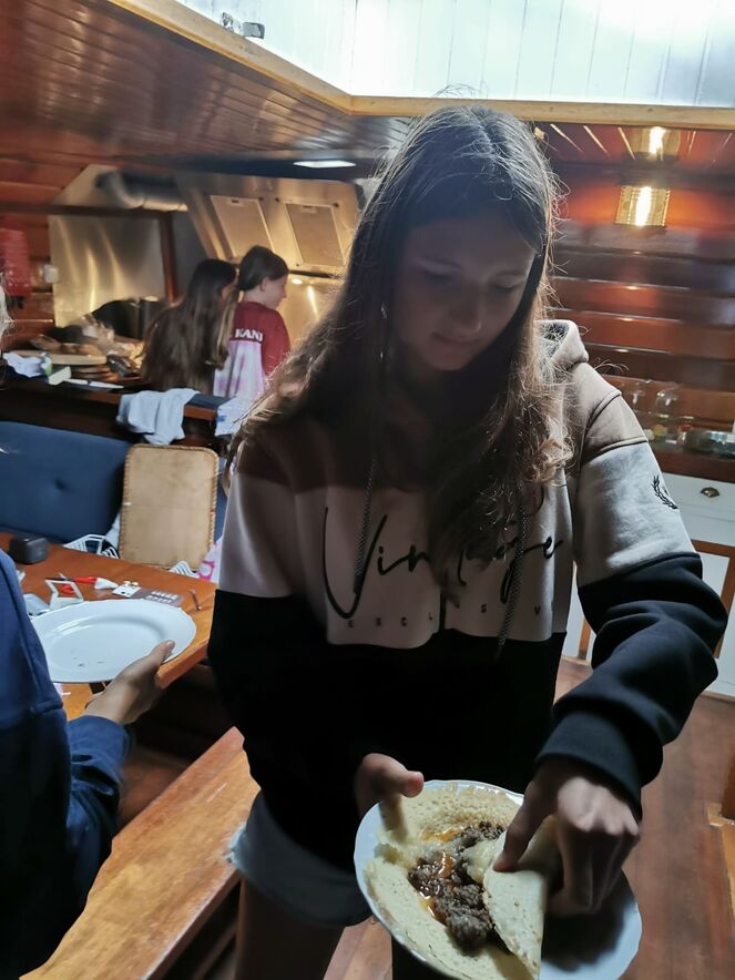 Bevor wir selbst aufs Boot gingen, machte sich ein Teil der Jugendlichen auf den Weg zum Einkaufen, damit wir für die ersten zwei Tage ausreichend Verpflegung an Bord hatten. Danach ging es zu unserem Schiff, wo wir es uns gemütlich einrichteten und gemeinsam einen Kochplan erstellten, wer wann kocht, wurde in Absprache mit den Jugendlichen festgelegt.