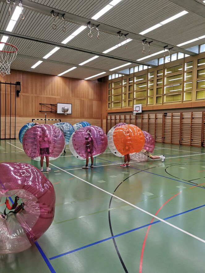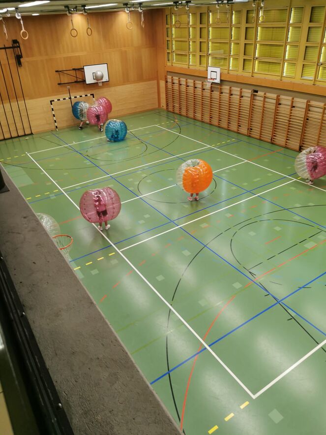 Dann begann die Schatzsuche! Mit unterschiedlichen Aufgaben mussten die Jugendlichen gemeinsam den nächsten Ort finden – bis wir schliesslich bei einer Turnhalle ankamen, unserem ersten Ziel. Dort hatten wir jede Menge Spass: Wir spielten Bubble Soccer und Burgervölk.
