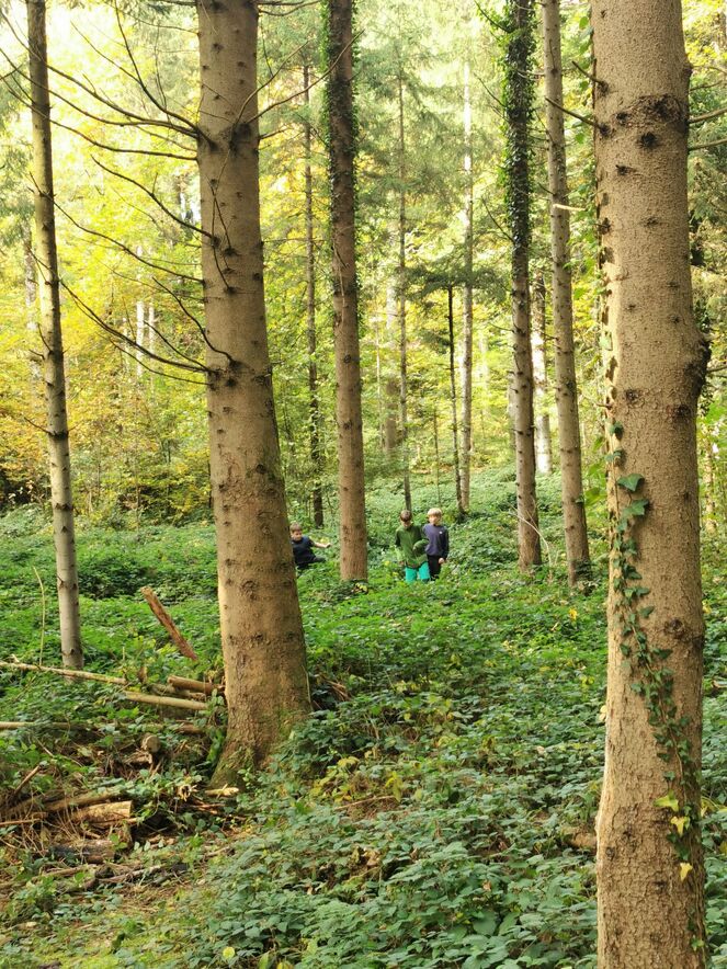 Wir starteten wieder beim Gruendemoosparkplatz und erzählten die Geschichte. Danach liefen wir, vollgepackt mit unserem Material, in den Wald zu einem wunderschönen Platz. Dort legten wir alles ab und bildeten Zweier- und Dreiergruppen, um unser Vertrauen unter Beweis zu stellen.