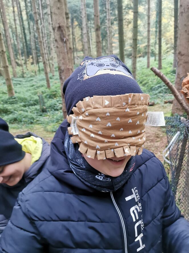 Zuerst hielten wir uns an den Händen und liefen blind durch den Wald. Danach mussten die Blinden nur mithilfe einer sehenden Person, die den Weg beschrieb, an einen bestimmten Ort gelangen – gar nicht so einfach!