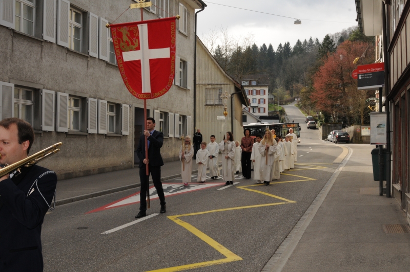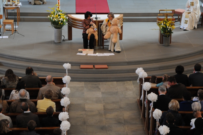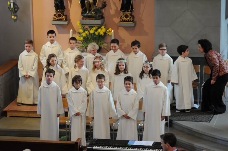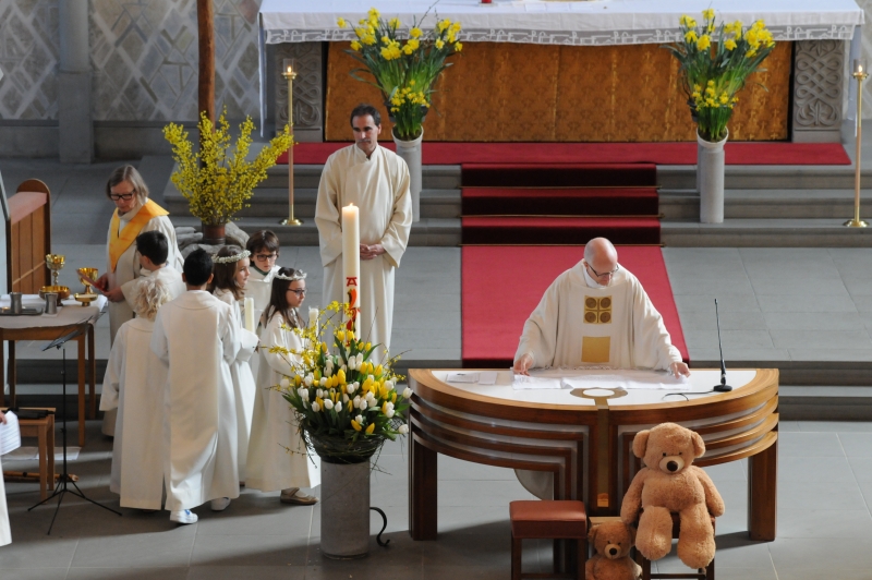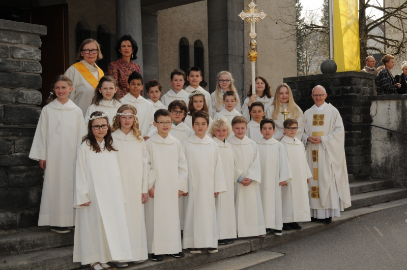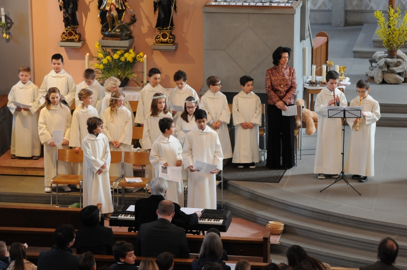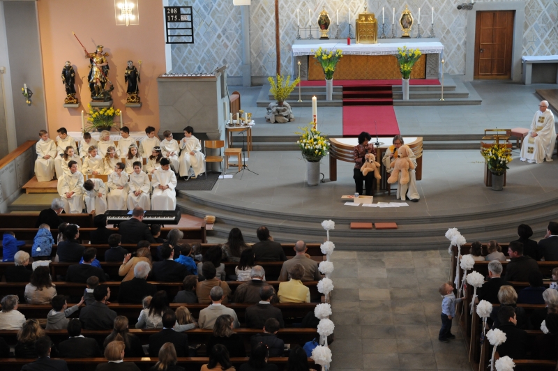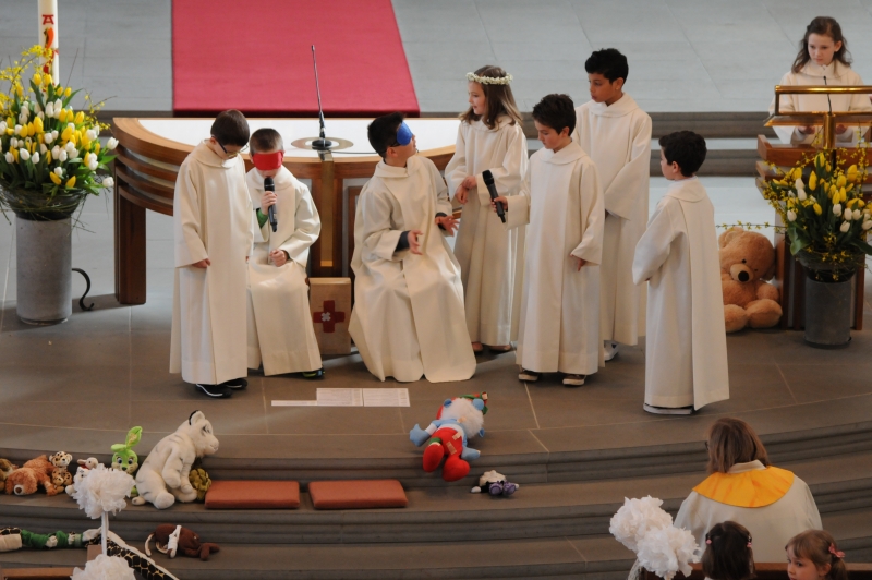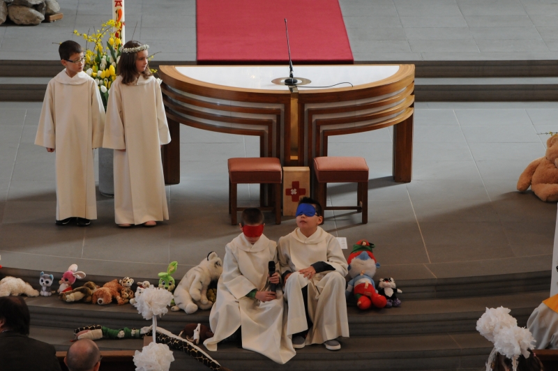 Am Sonntag, 3. April feierten in St. Georgen bei strahlendem Sonnenschein 18 Kinder mit ihren Familien und allen Pfarreiangehörigen die Aufnahme in die eucharistische Tischgemeinschaft. Unter dem Thema "Erste Hilfe durch und mit Jesus" spielten sie das Evangelium der Blindenheilung und machten sich Gedanken, wie "Erste Hilfe" im Alltag und in der Beziehung zu Gott aussieht.