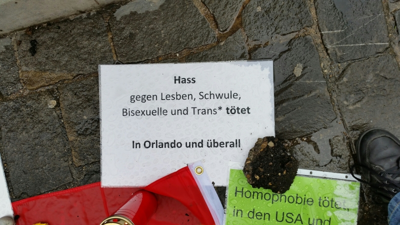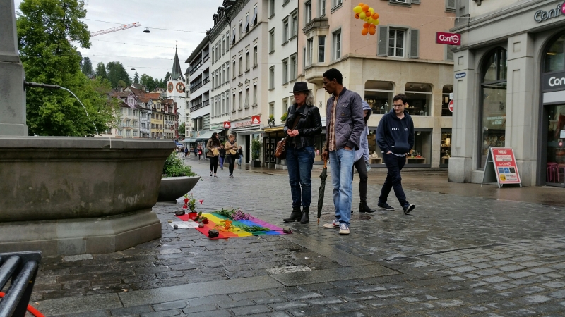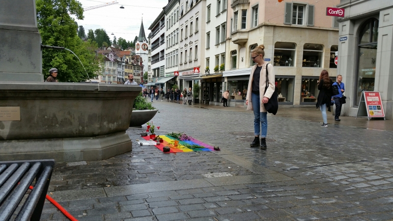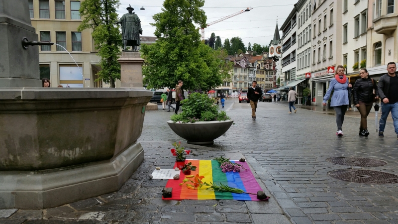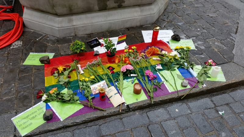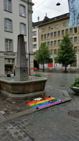 Vom 13. – 19. Juni gedenken viele Menschen am Ort der Anteilnahme in der Marktgasse den Opfern. «Wir wollen uns daran nicht gewöhnen! Wir werden uns daran nicht gewöhnen!» 50 Tote in einem Schwulen-Club in Orlando / Florida!