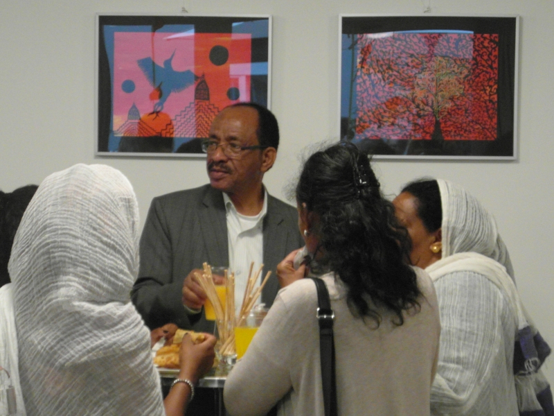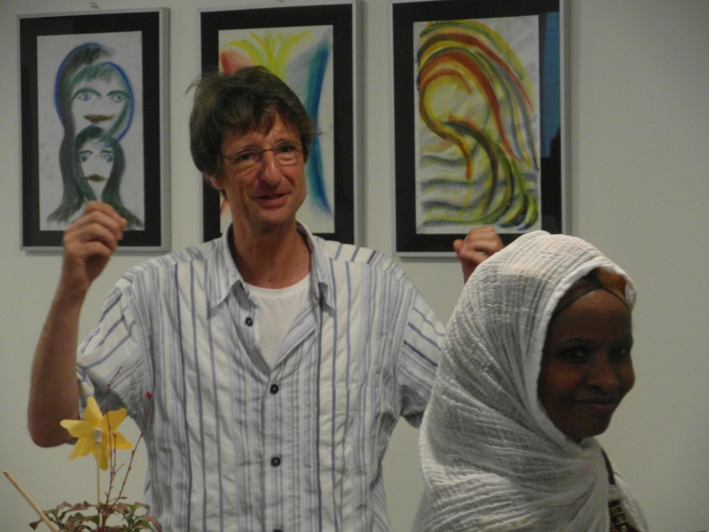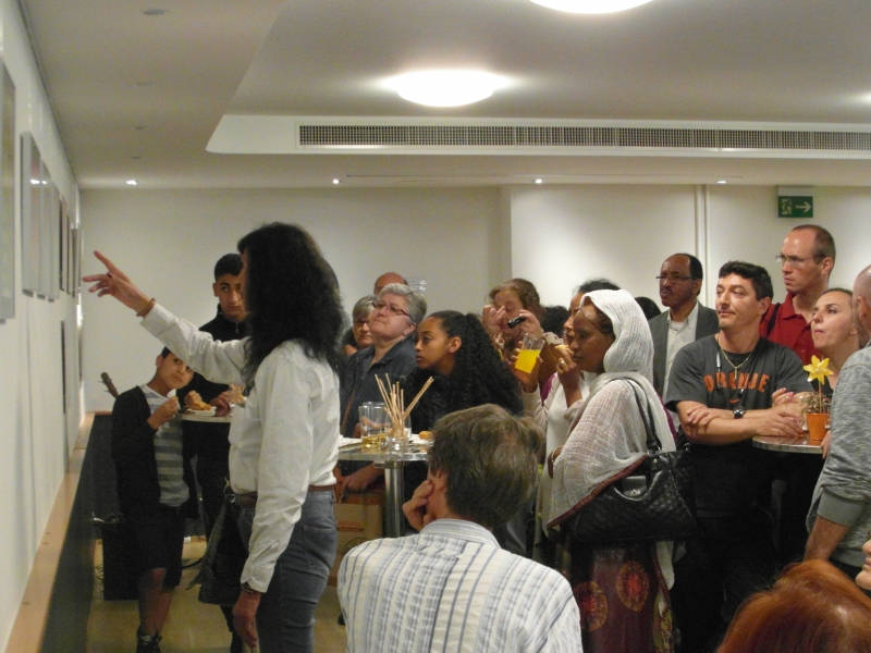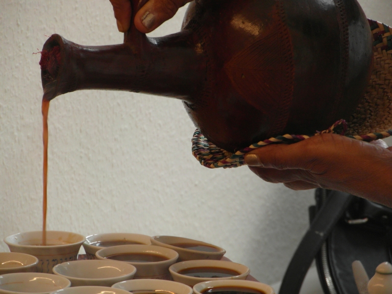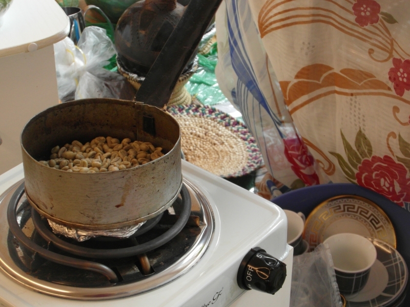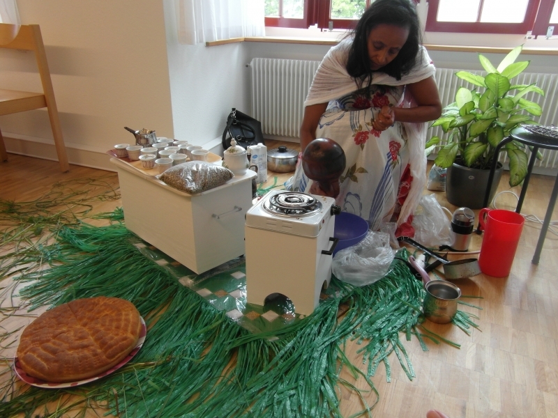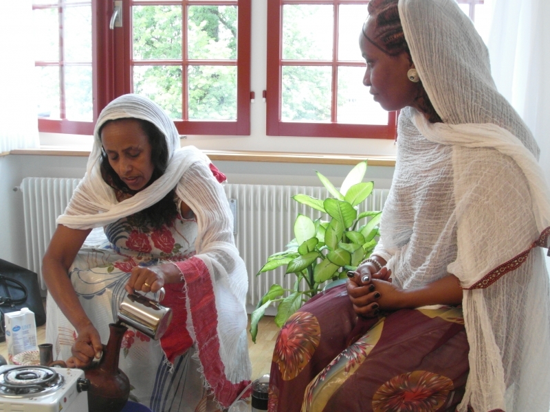 Gleich zu Beginn lockt ein verführerisch köstlicher Duft von frisch gerösteten Kaffeebohnen die Besucherinnen und Besucher in den oberen Stock. Dort verzaubern zwei eritreische Frauen die Anwesenden mit einer traditionellen eritreischen Kaffeezeremonie.