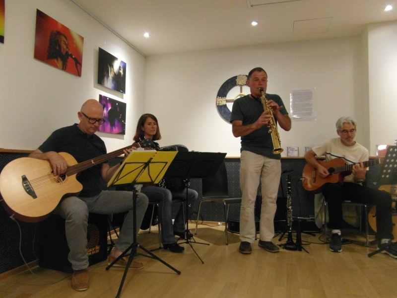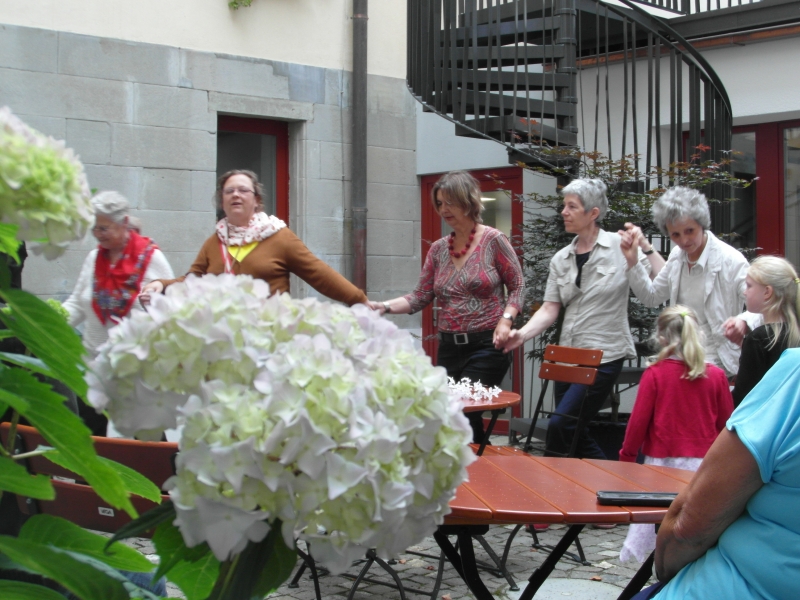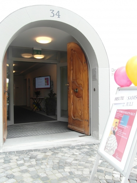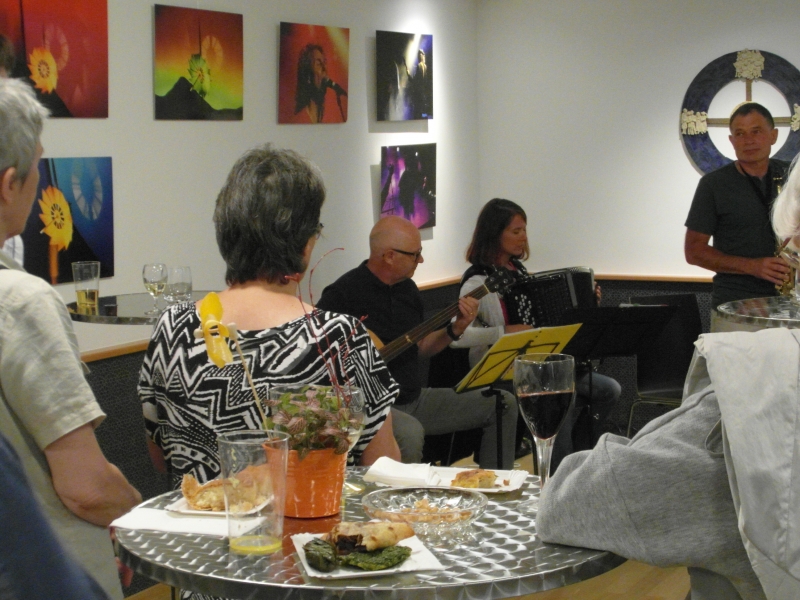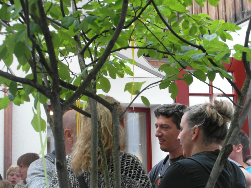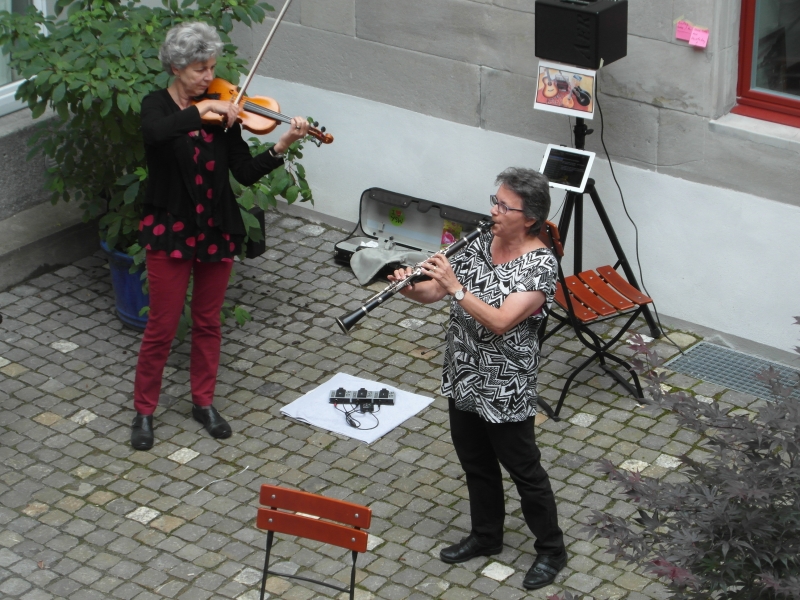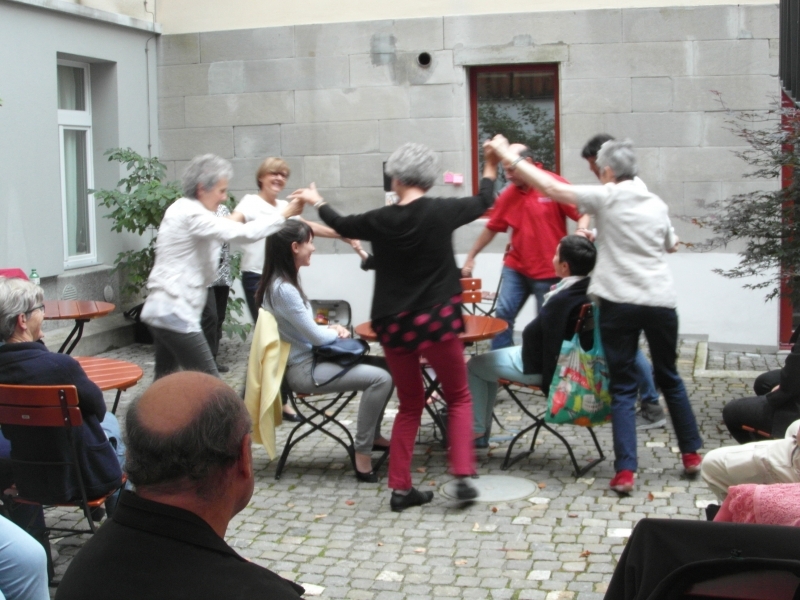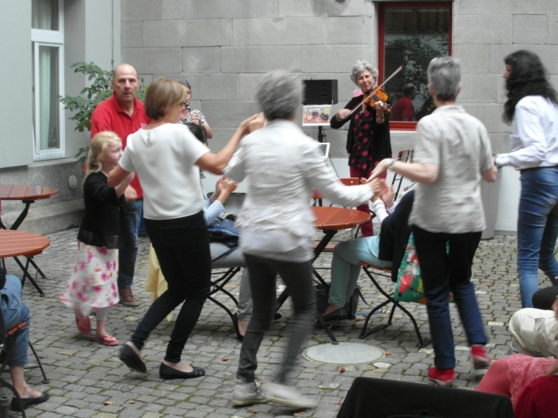 Im Innenhof spielt bald darauf die Musik auf und spätestens mit den Klängen von ocho manos und Anitas Klezmer-Küche werden die Gäste in eine heiter-fröhliche Stimmung versetzt und manches Tanzbein zum Schwingen gebracht.