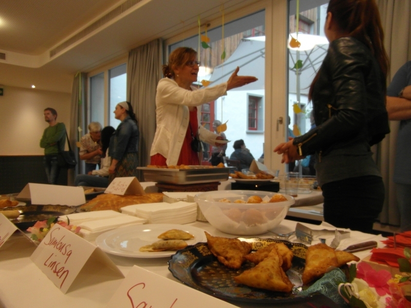 In der Zwischenzeit ist das bunte und reichhaltige Apero-Buffet bereitgestellt, mit Köstlichkeiten aus den verschiedensten Ländern. Besucherinnen des internationalen Frauentreffs FrauenLachen, welcher von Carola Zünd geleitet wird, haben die feinen Häppchen mit viel Liebe und Engagement zubereitet.
