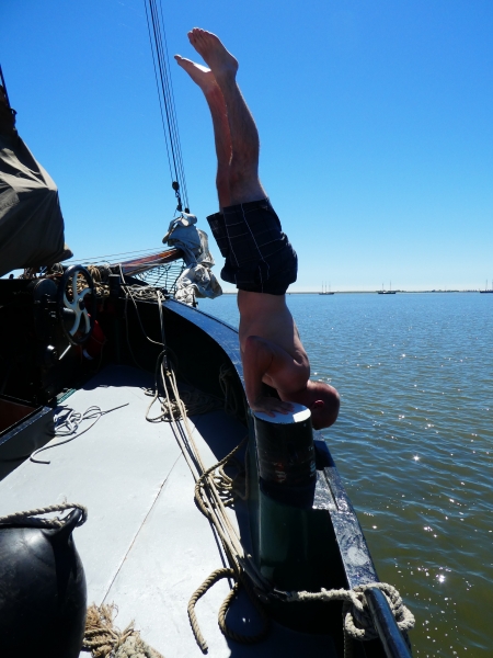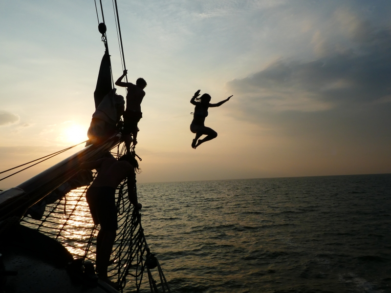 Bei strahlendem Sonnenschein wurde der Anker ins Wasser gelassen. Wir kühlten uns im Süsswasser ab. Wer noch mehr Action wollte sprang vom vordersten Mast.