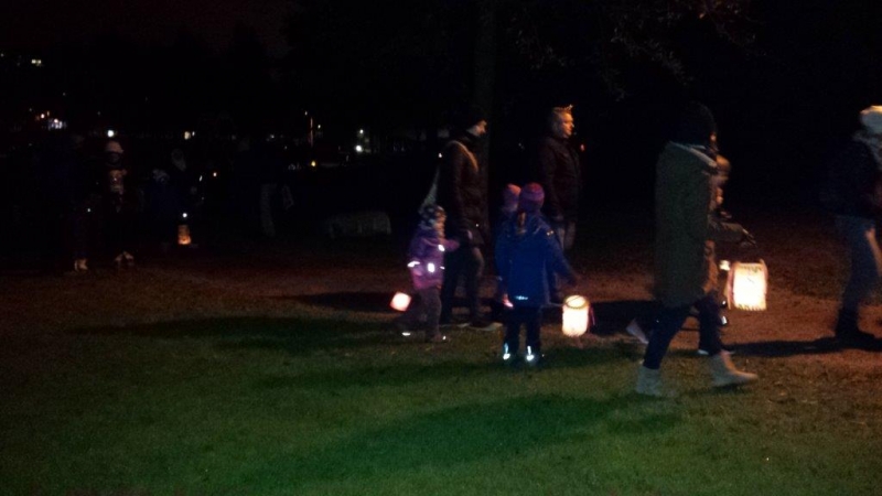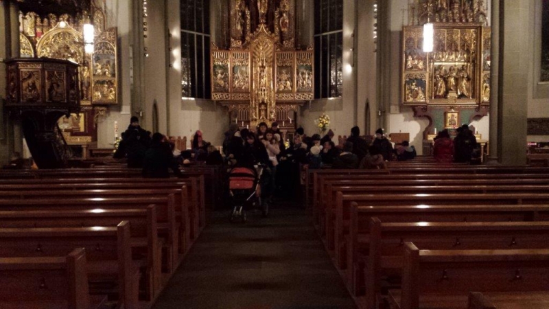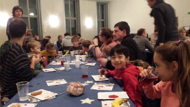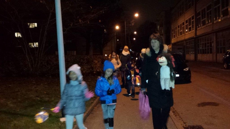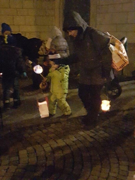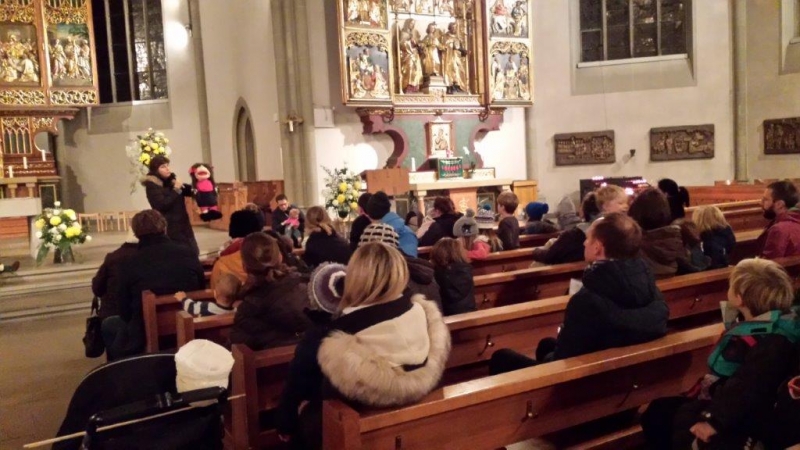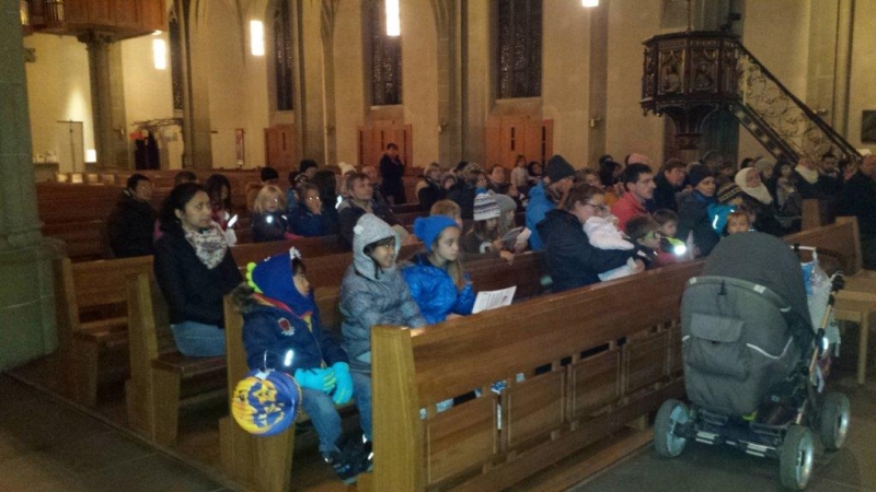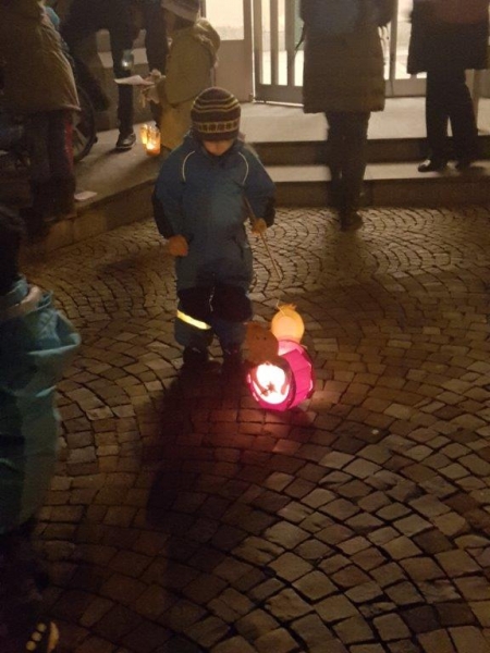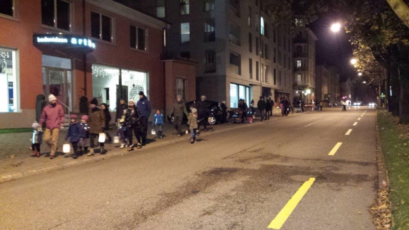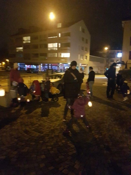 Laterne, Laterne, Sonne Mond und Sterne... so klange es auf der Kreuzbleiche, nachdem die Kinder und ihre Eltern in der katholischen Kirche St. Otmar der Geschichte von Sterntaler gelauscht haben. Sie zogen mit ihren unterschiedlichen Laternen via Kreuzbleiche zum evangelischen Kirchgemeindehaus Lachen. Dort angekommen wurden Gemeinsamkeiten von der Martinslegende und der Sterntaler-Geschichte aufgezeigt und das Ende der Geschichte erzählt. Leuchtende Sterne waren im Saal verteilt und durften von den Kindern aufgelesen werden. Einen Stern durften sie behalten, den anderen irgendjemandem weiterschenken. Reich beschenkt assen und tranken die Anwesenden Wienerli, Brot und Punsch.