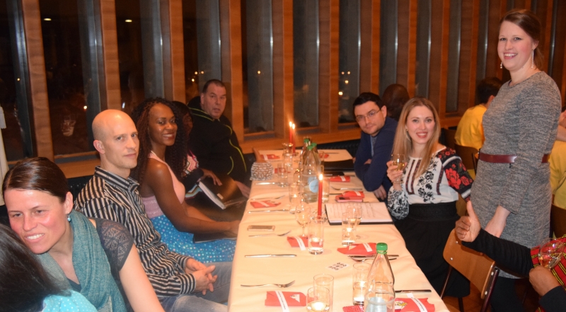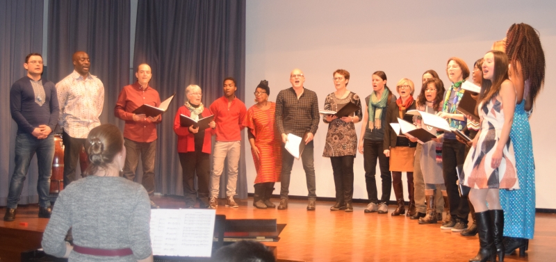 Jeannine Frommenwiler, die Dirigentin des Chores World Voices, bei einigen Sängerinnen und Sängern