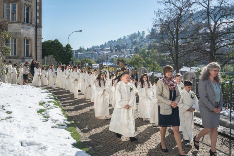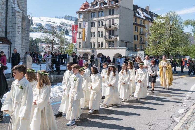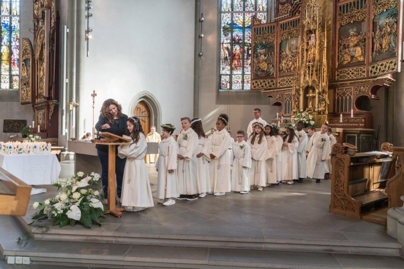 Am vergangenen Sonntag durften 31 Kinder die Erstkommunion empfangen. Die festliche Feier bewegte die Mitfeiernden in der bis auf den letzten Platz besuchten Otmarkirche. Die Eucharistiefeier wurde gesanglich von der Domsingschule gestaltet. Musikalisch begleitete ein Bläsertrio der Knabenmusik der Stadt St.Gallen die Prozession. Kraftvolles und freudiges Orgelspiel trugen dazu bei, dass dieser Festgottesdienst lange Zeit in bester Erinnerung bleiben wird.