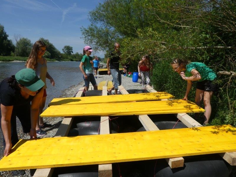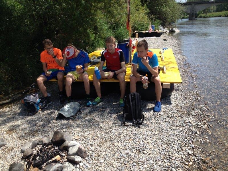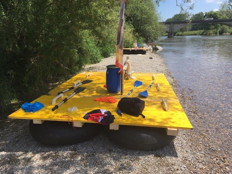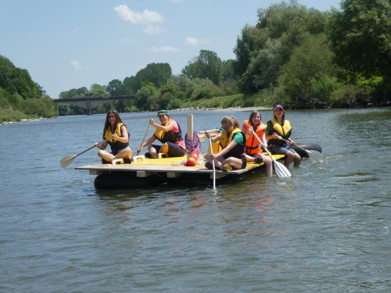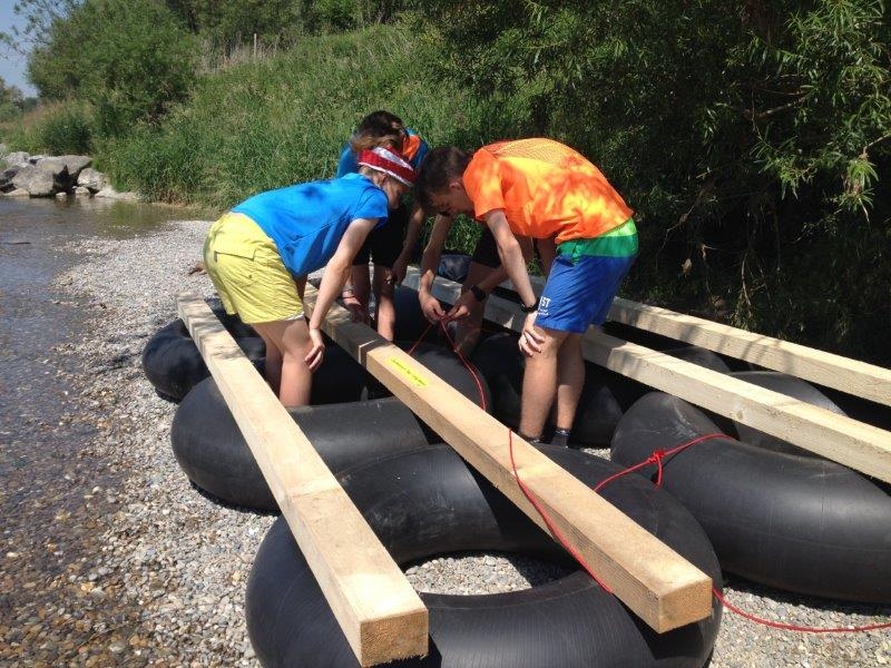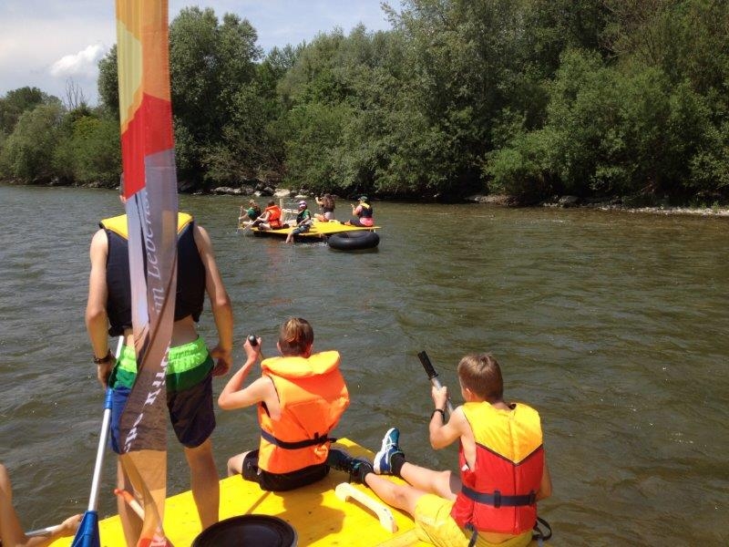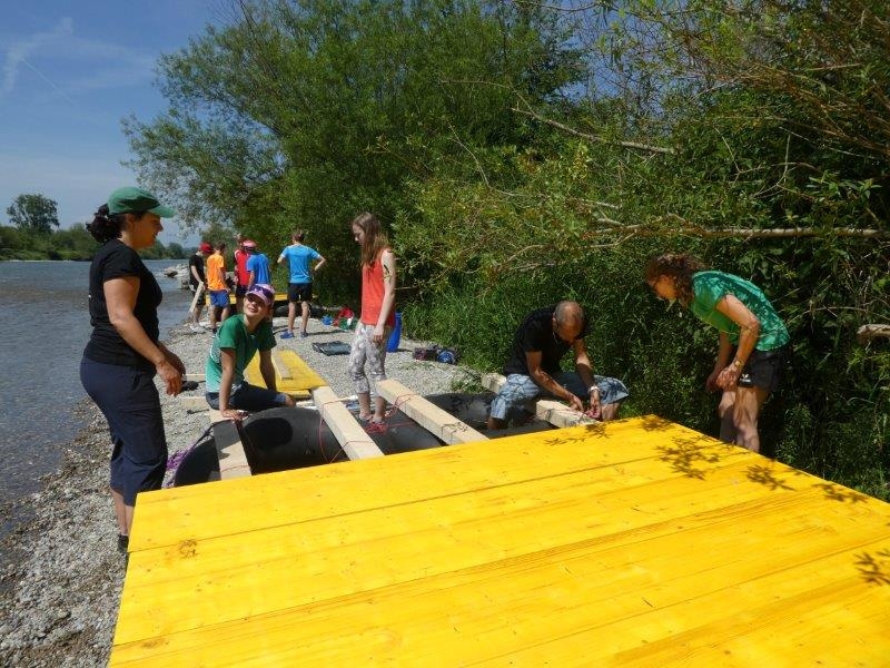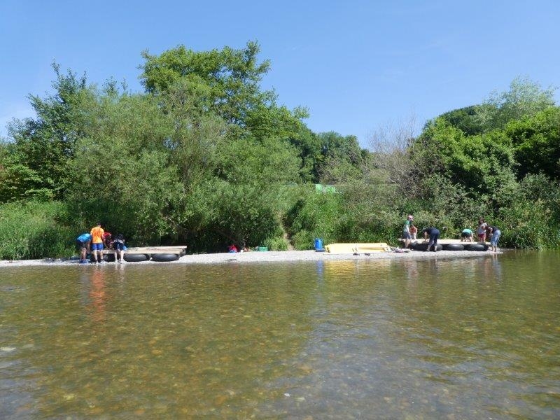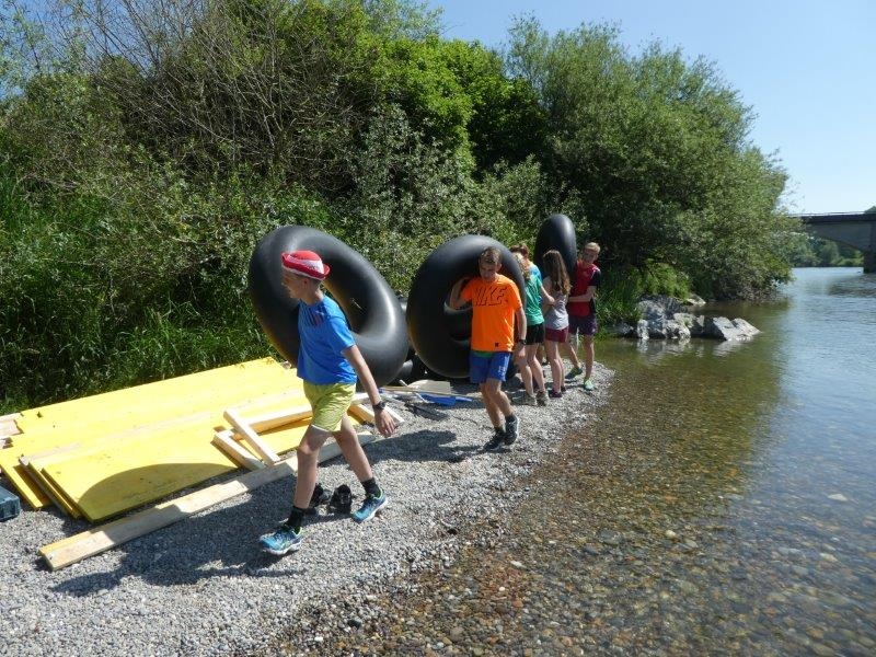 Dies war das Motto unseres Pfingstwochenendes. Zuest galt es, aus alten Lastwagenschläuchen, Balken und Brettern zwei grosse Flosse zusammen zu zimmern. Mit dem Segen der Seepolizei konnten wir dann nach dem Mittagessen endlich die Anker lichten. So verbrachten wir auf der Thur zwischen Frauenfeld und Andelfingen ein unvergessliches Abenteuer mit viel Sonnenschein.