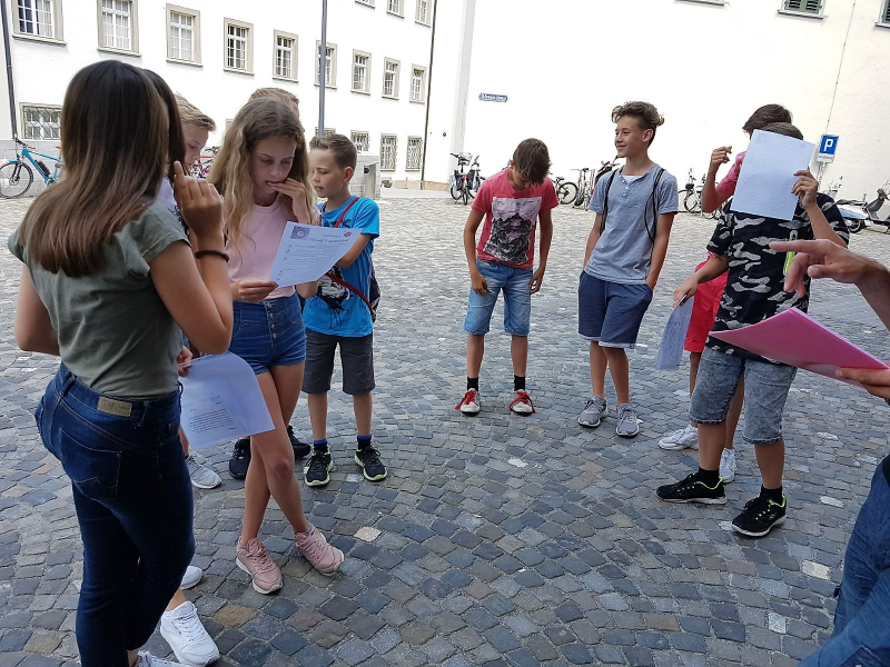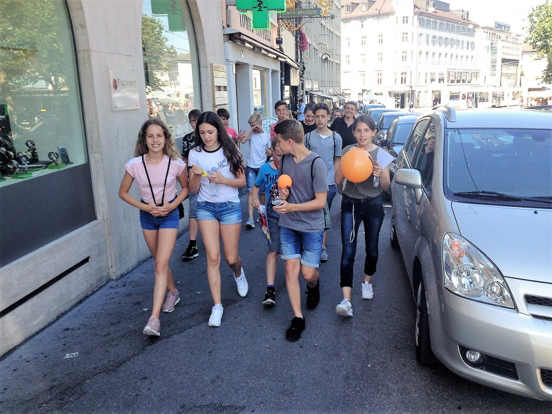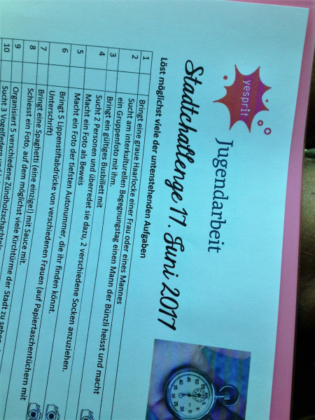 Der Interkulturelle Begegnungstag bot am Samstag 17. Juni den geeigntetn Rahmen für unsere Stadt-Challenge. In 4er Gruppen hatten die Jugendlichen die unterschiedlichsten Herausforderungen und Aufgaben zu lösen. Dazu waren Schnelligkeit, Krativität, Mut, eine gute Taktik und auch viel Charme gefragt. So gelang es den Jugenldichen unter anderem, sich in einer Polizeiuniform fotografieren zu lassen, 5 Lippenstiftabdrücke von verschiedenen Frauen zu bekommen oder zwei Passanten zu überreden, zwei verschiedene Socken anzuziehen. Alle hatten einen riesen Spass dabei und als Belohnung gab es ein leckeres Glace.